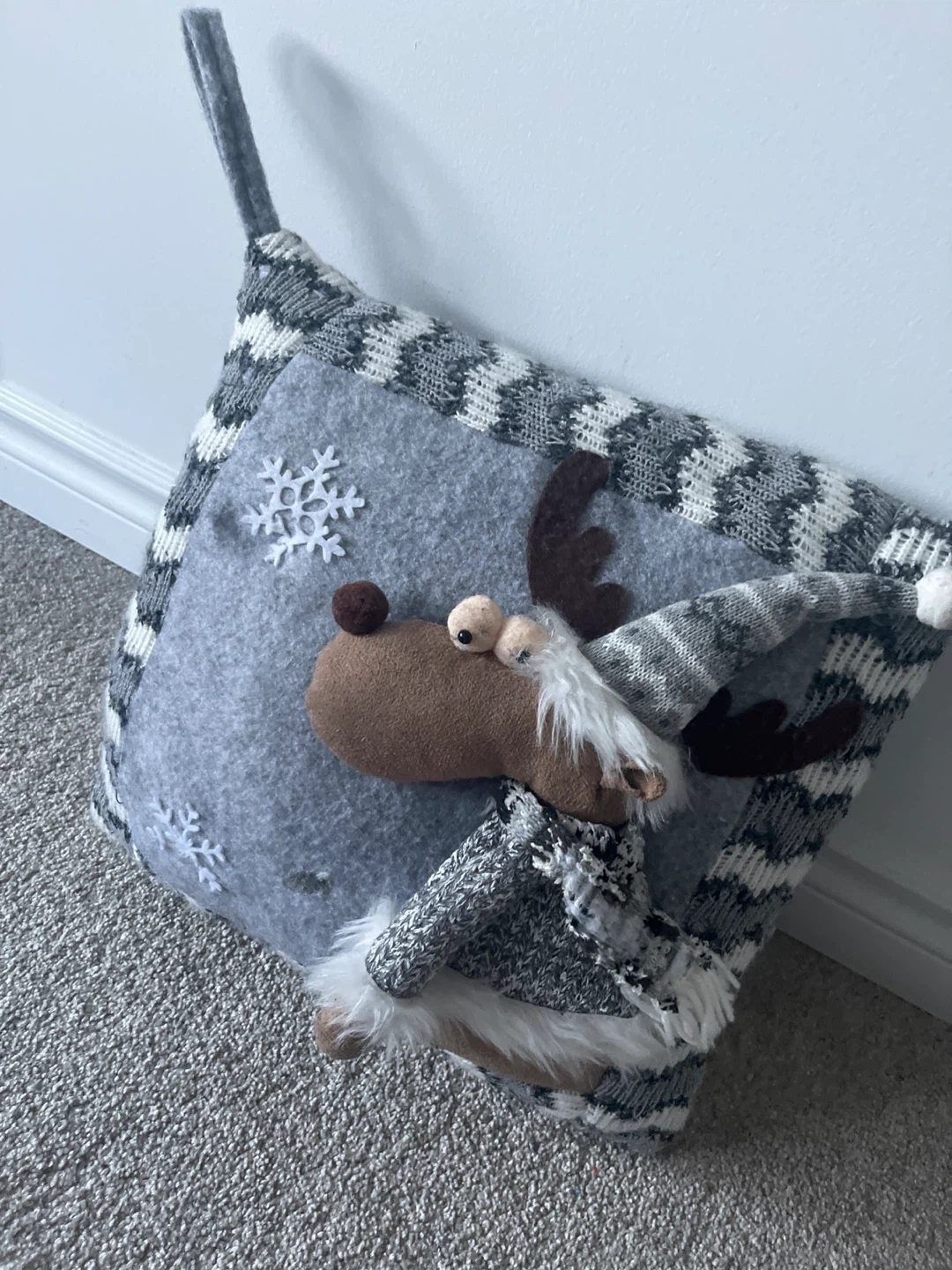 Selling a cute reindeer Christmas pillow! It's in great condition and perfect for adding a festive touch to your home this holiday season smoke and pet free home 🏠