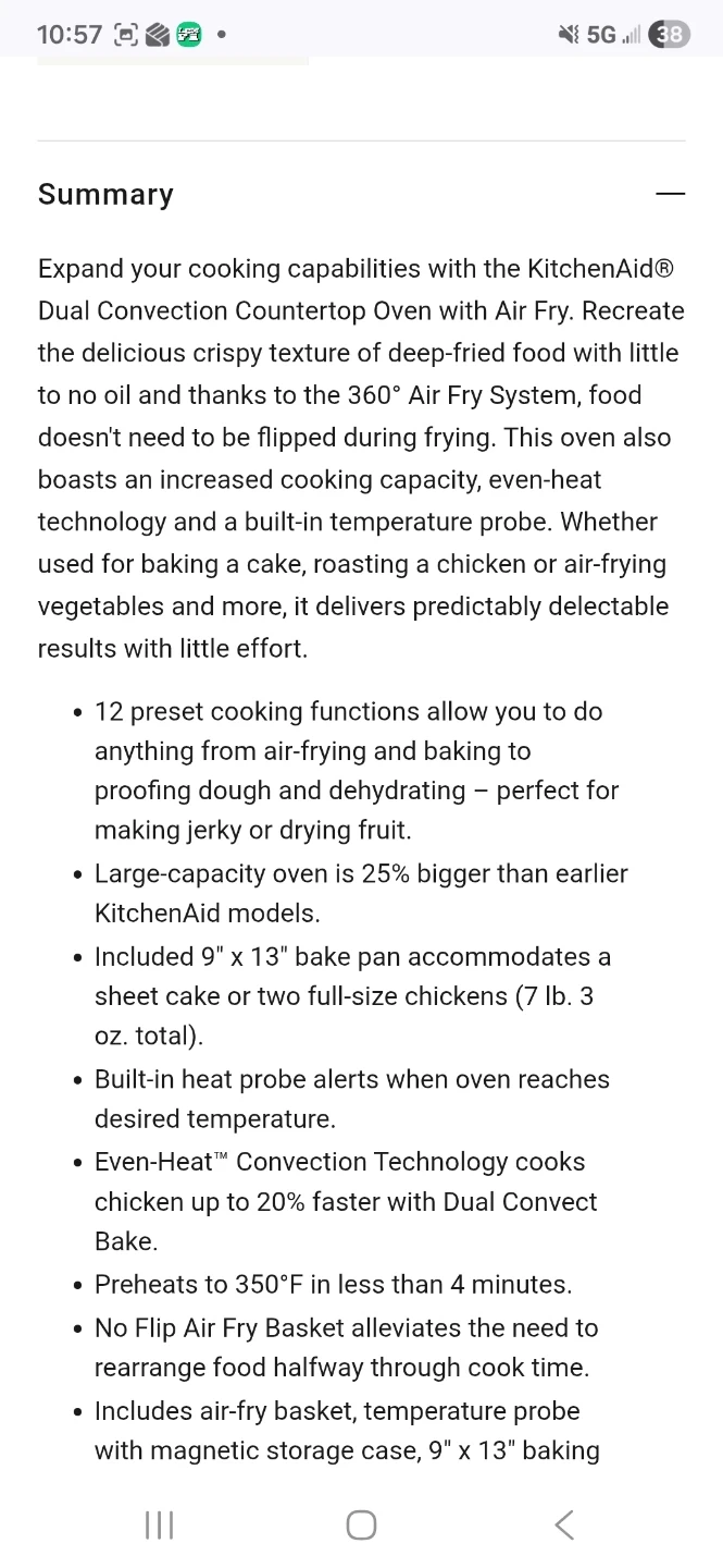 This KitchenAid digital countertop oven is perfect for all your cooking needs! It comes with a variety of accessories, including a rack, pan, and air fryer basket. It's brand new in box . It is black in colour and has a digital display.