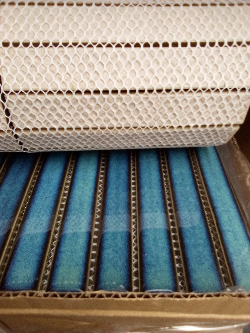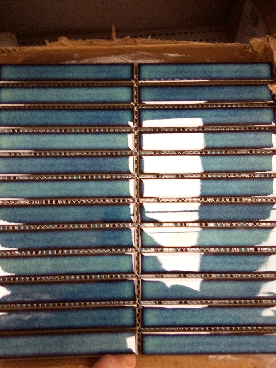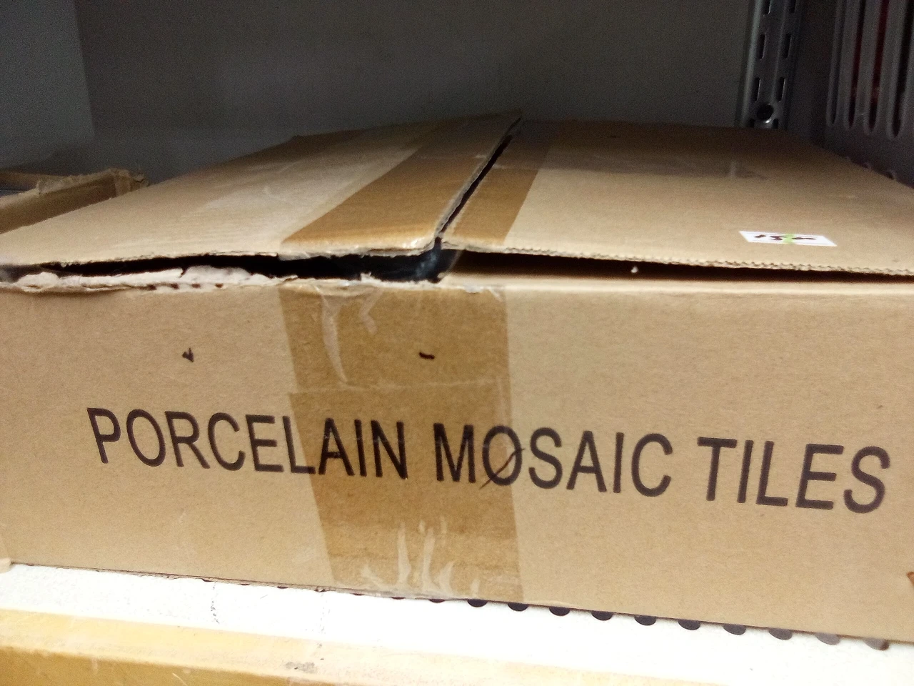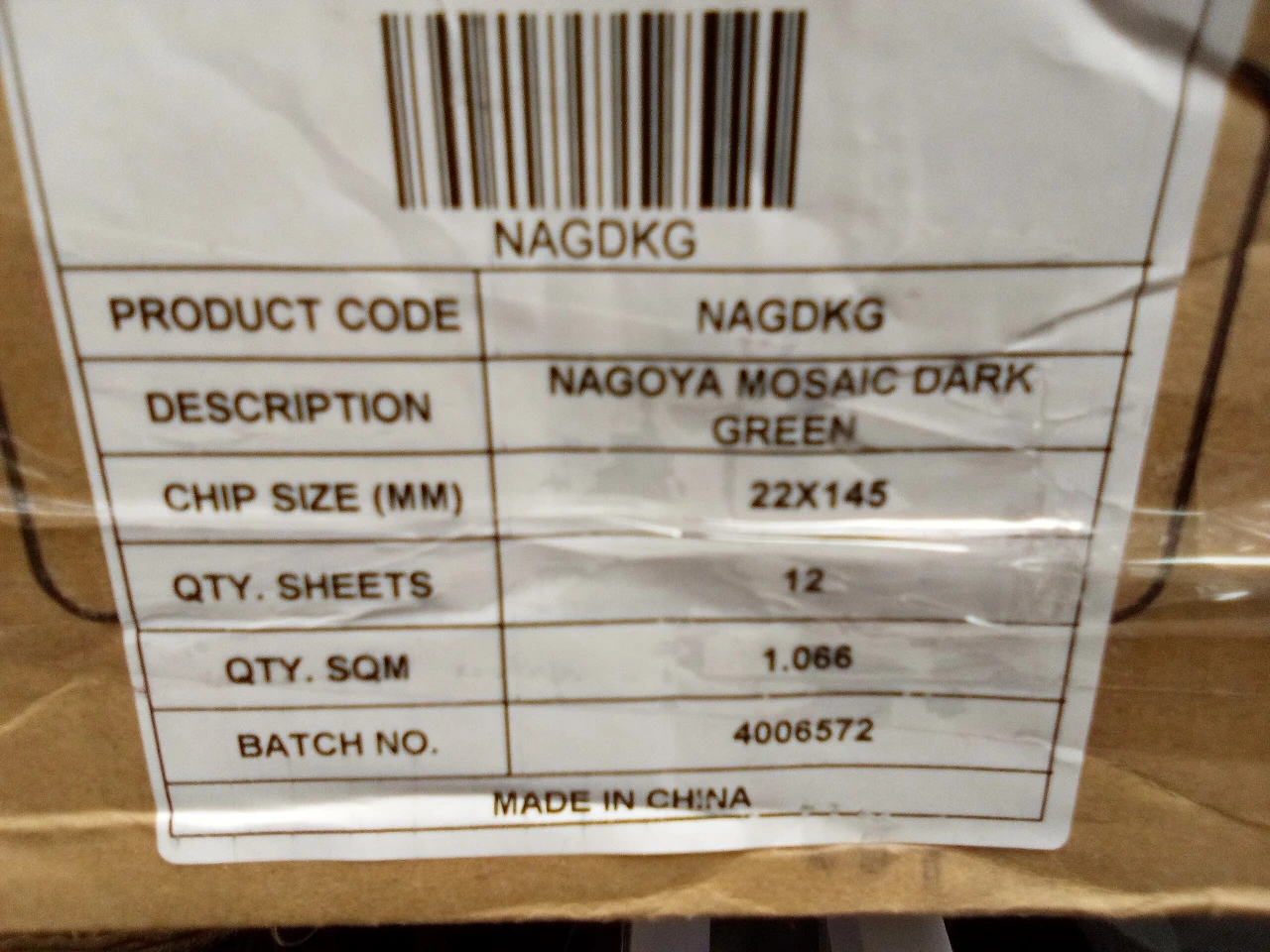 Selling 2 boxes of porcelain mosaic tiles in a dark green mosaic colour. Each box contains 12 sheets, covering 1.066 square meters. Each chip measures 22x145 mm. Selling as project finished with leftover tiles.