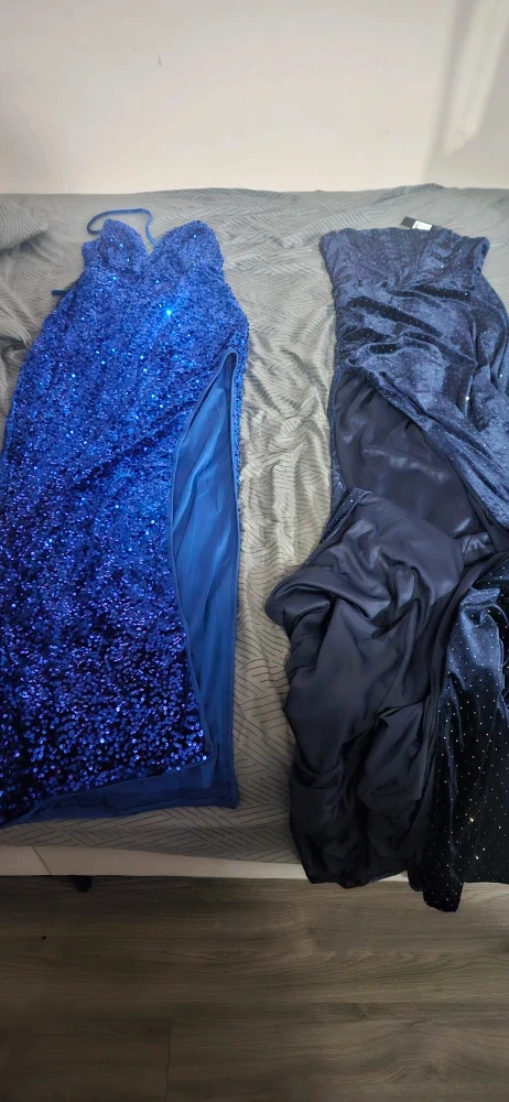 Two beautiful blue dresses for sale! One is a vibrant, sparkly blue with a high slit, perfect for a night out. The other is a darker navy blue, also with sequins, giving it a subtle shimmer. Both dresses are in great condition and ready for a new home