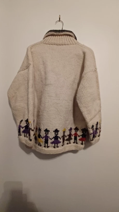 Cozy up in this Tejidos Analia sweater! It's made of 100% wool and features a unique design with a button-up neck and a cute pattern of people holding hands around the bottom. Pit to pit - 22" Wait to neck - 23"