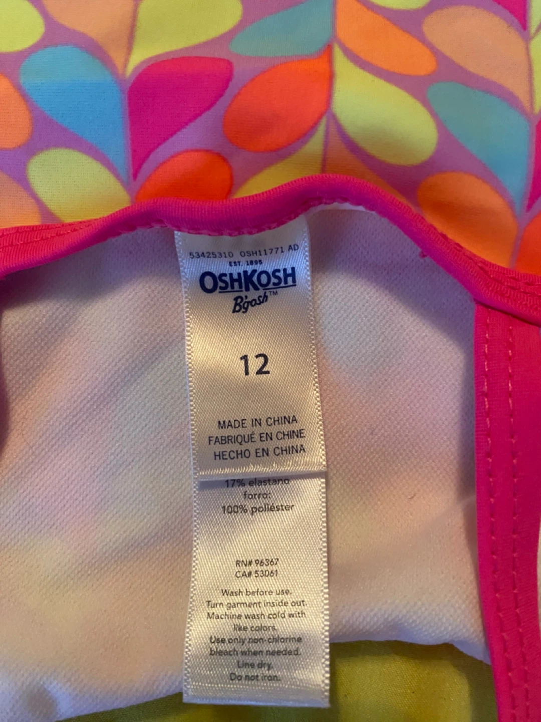 This OshKosh B'gosh swim top is perfect for your little one! It's a size 12 and features a colourful pattern with pink trim. The material is made of 17% elastano and 100% polyester, making it comfortable and easy to care for. Great for the pool or beach!