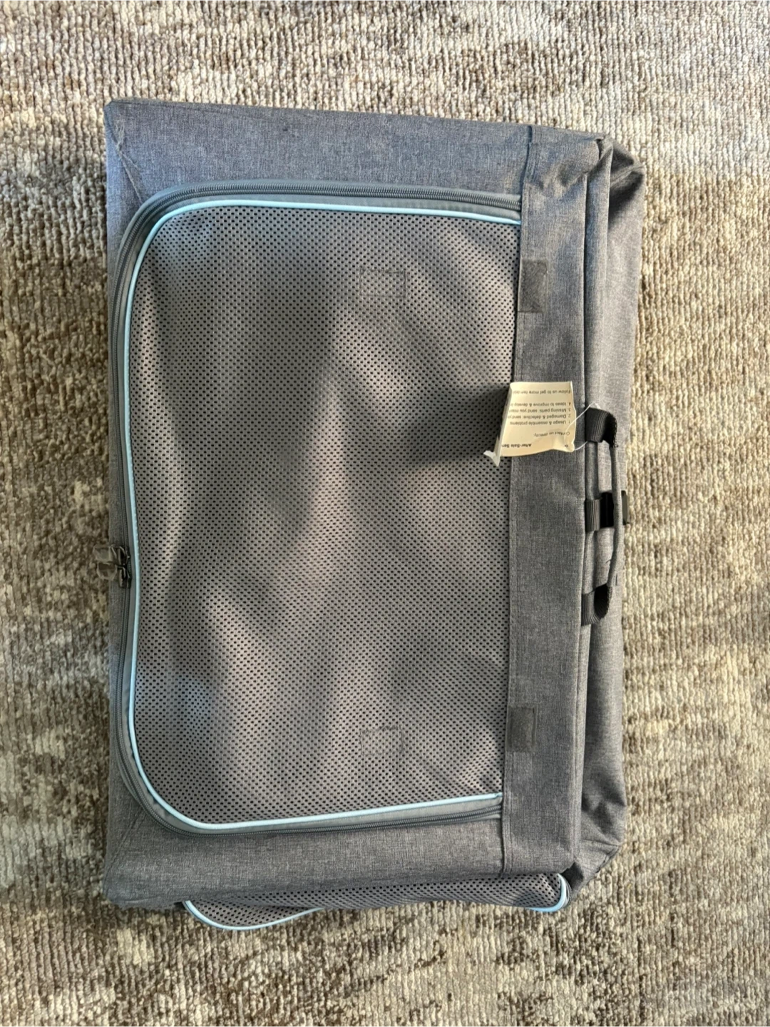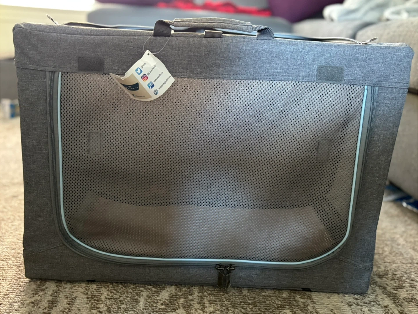 Really nice soft sided crate but I decided I wanted something else (I ended up buying something similar but that you can take on an airplane as well) I have missed the return cutoff for this crate now. My cockapoo puppy used it 3-4 times for short periods of time. No accidents, rips, tears, etc. Really easy to set up and then store when not in use; easy to take to someone else’s house / on the go. (Tried to take a video but it was a bit more challenging with one hand filming😅).