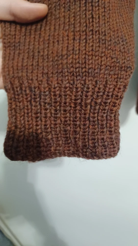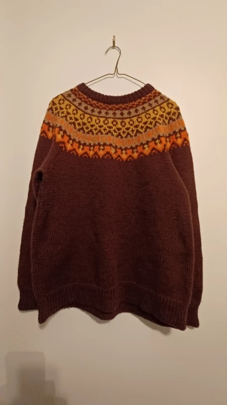 Selling a cozy brown knit sweater with a unique patterned design! It's perfect for staying warm and stylish during the colder months. The sweater features a lovely mix of brown, yellow, and orange tones in its knitted pattern, adding a touch of flair to any outfit