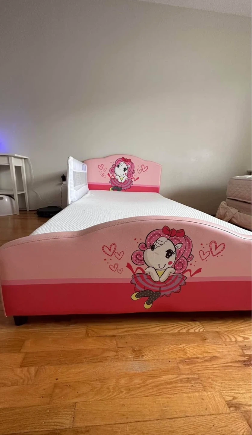 Selling a cute unicorn-themed bed for kids! It's in great shape and would be perfect for a little one's room. The bed is pink with a fun unicorn design on the headboard and footboard. It doesn’t include a safety rail on one side. With mattress