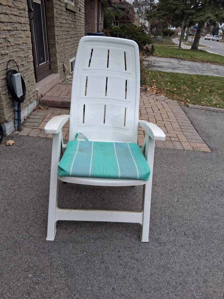 Buy & SellWhite Plastic Outdoor ChairWhite Plastic Outdoor Chair$23Selling a white plastic outdoor chair. It comes with a striped cushion. Perfect for your patio or garden!ConditionGood0 chats·0 favorites·2 viewsSELLERWayne McdonaldBridlewood100 reviewsWHERE TO MEETReginos Pizza / Finch&brimley