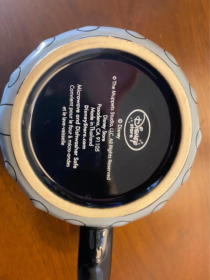Black Muppet mug with Animal design. Dishwasher and microwave safe. Made in Thailand. Great condition! Muppets Animal Disney Store Embossed Coffee Mug in black and purple with a raised 3D image of Animal on the side and chain wrapped around. Great condition with no chips or cracks.