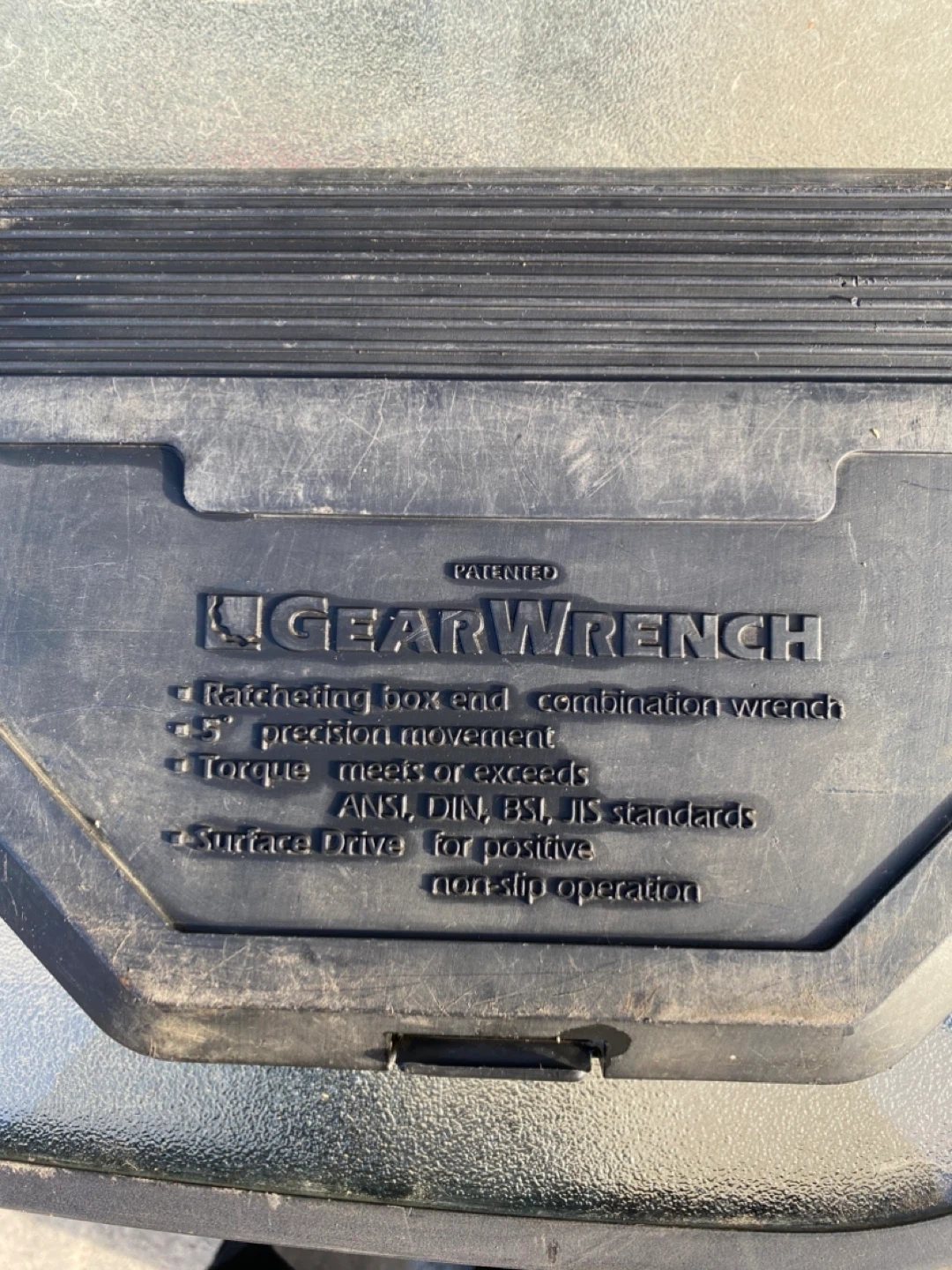 Selling a GEARWRENCH ratcheting box end combination wrench set. It comes in a case and includes multiple wrench sizes. The case says it features a 5° precision movement and surface drive for positive non-slip operation.