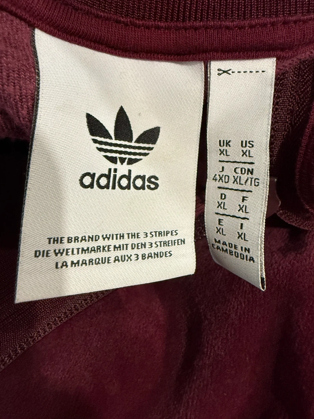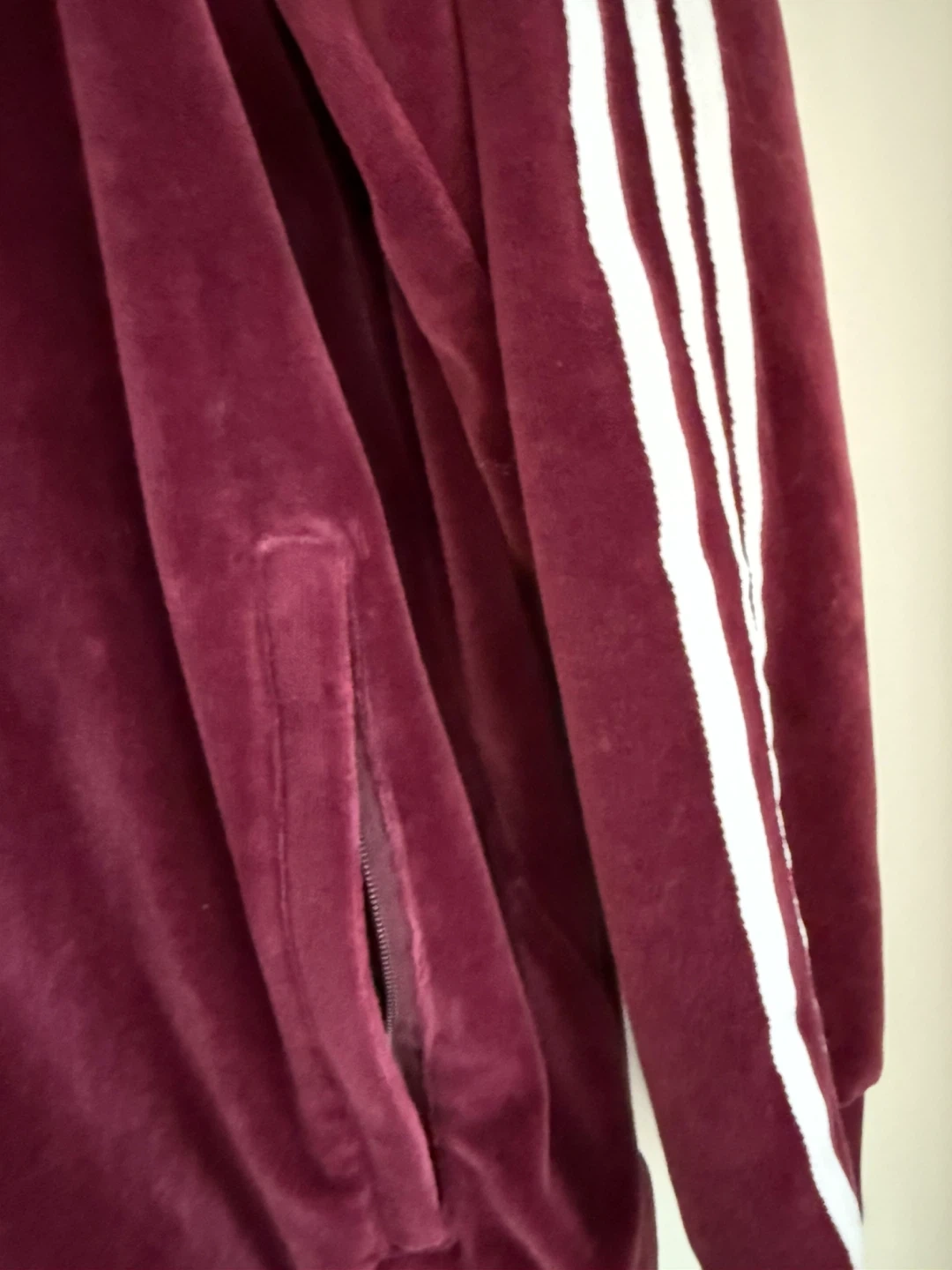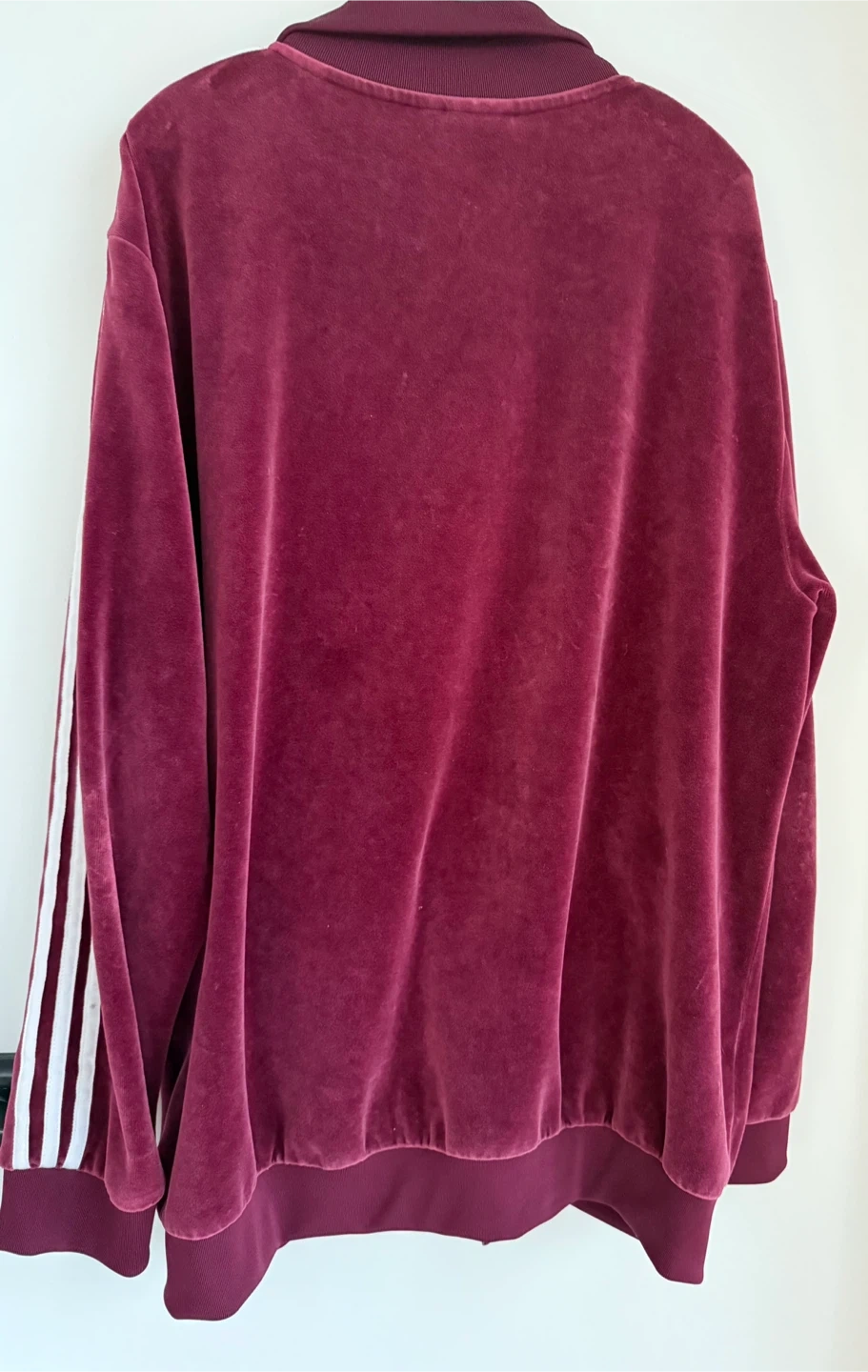 Selling an Adidas velour track jacket in size XL. It's a really comfy jacket with the classic Adidas stripes down the sleeves!