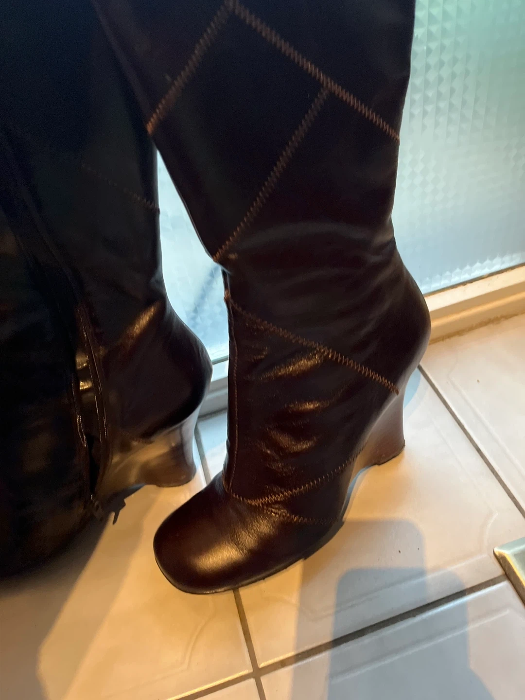 Stylish Aldo brown leather wedge boots, size 9 (39 European). These boots feature a unique stitched design and a comfortable wedge heel. Perfect for adding a touch of elegance to your wardrobe!
