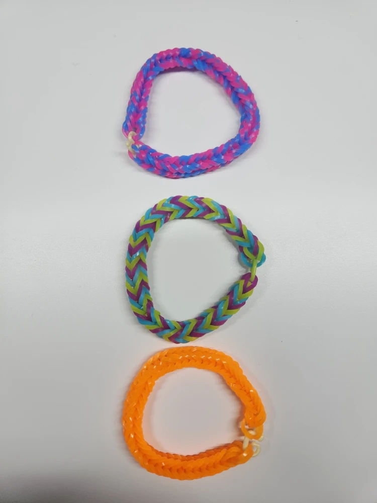 Selling a set of three handmade loom bracelets! They come in a variety of colours, including pink and blue, green and purple, and orange. A fun accessory for kids!