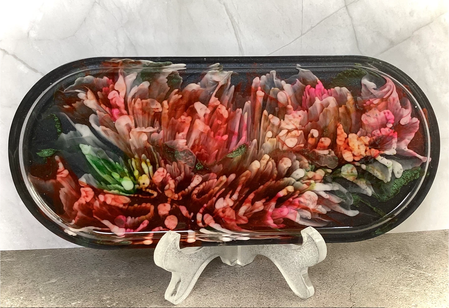 Selling a beautiful handmade resin art tray! Each tray features unique floral designs and vibrant colours. Perfect for adding a touch of artistry to your home