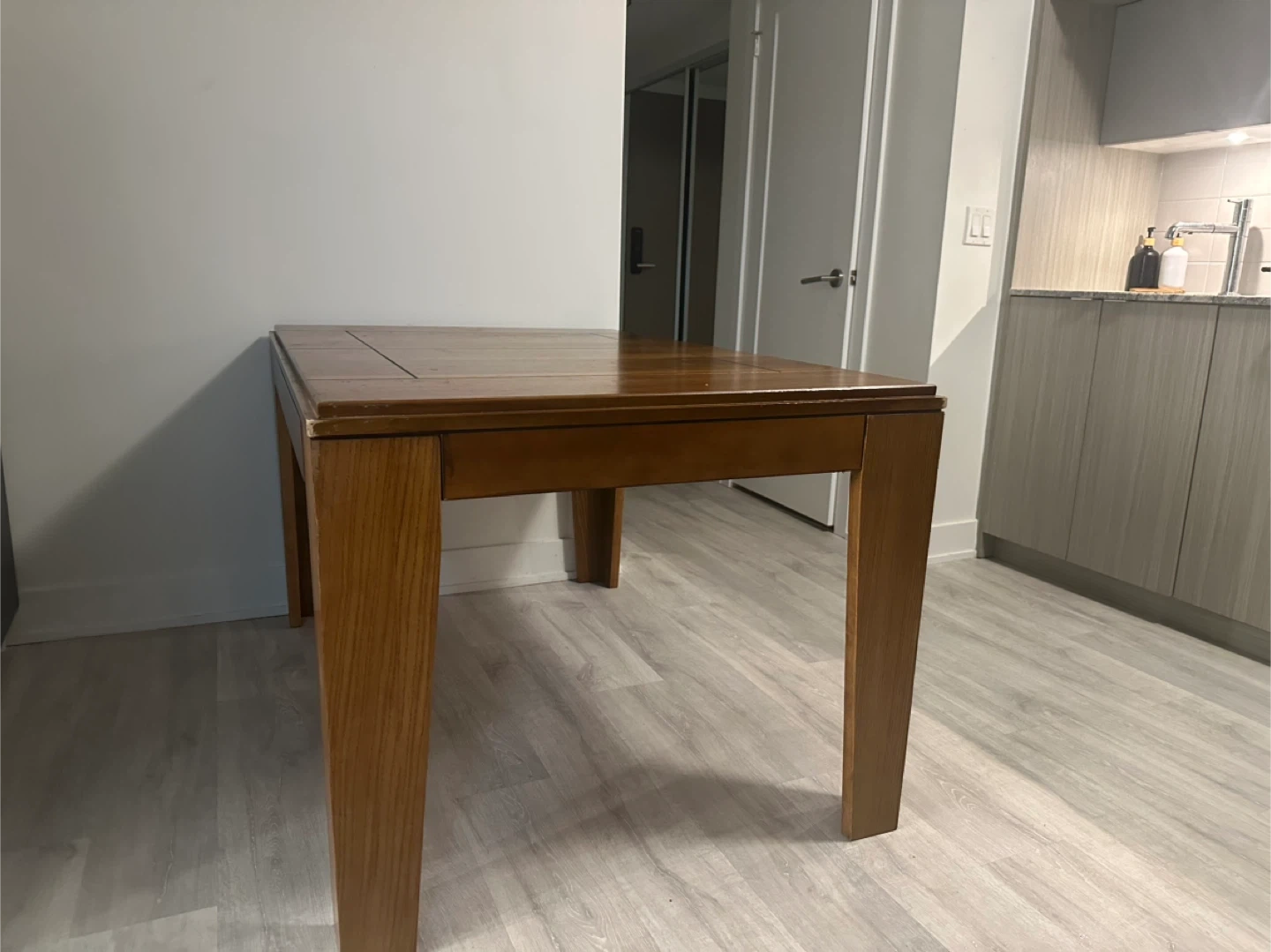 Selling a wooden dining table that's in great condition. It's a lovely piece that would fit well in any dining space. It has a beautiful finish and sturdy construction, perfect for everyday meals or gatherings with friends and family