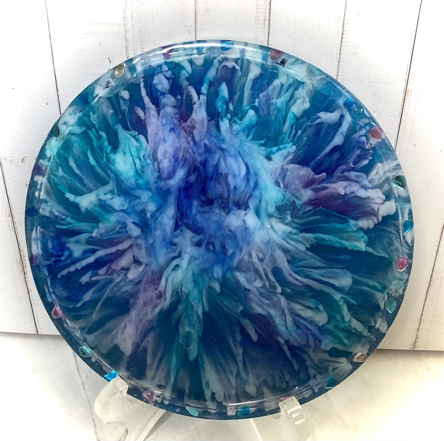 This is a beautiful handmade resin art tray featuring a unique blue and white design. It's perfect for adding a touch of artistry to your home decor!