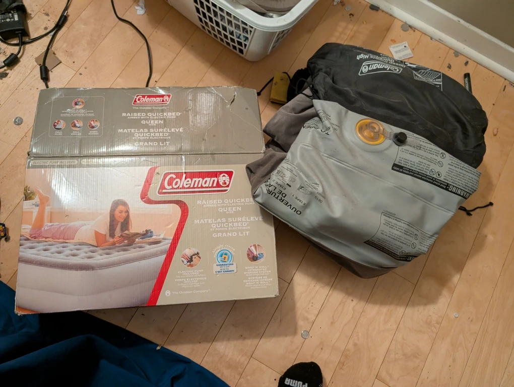 Selling a Coleman Queen Raised Quickbed (Grand Lit). It's a queen-sized air mattress with a built-in electric pump for easy inflation and deflation. Comes with its original box and carrying bag. Perfect for camping or guests! Can't find the pump, though.