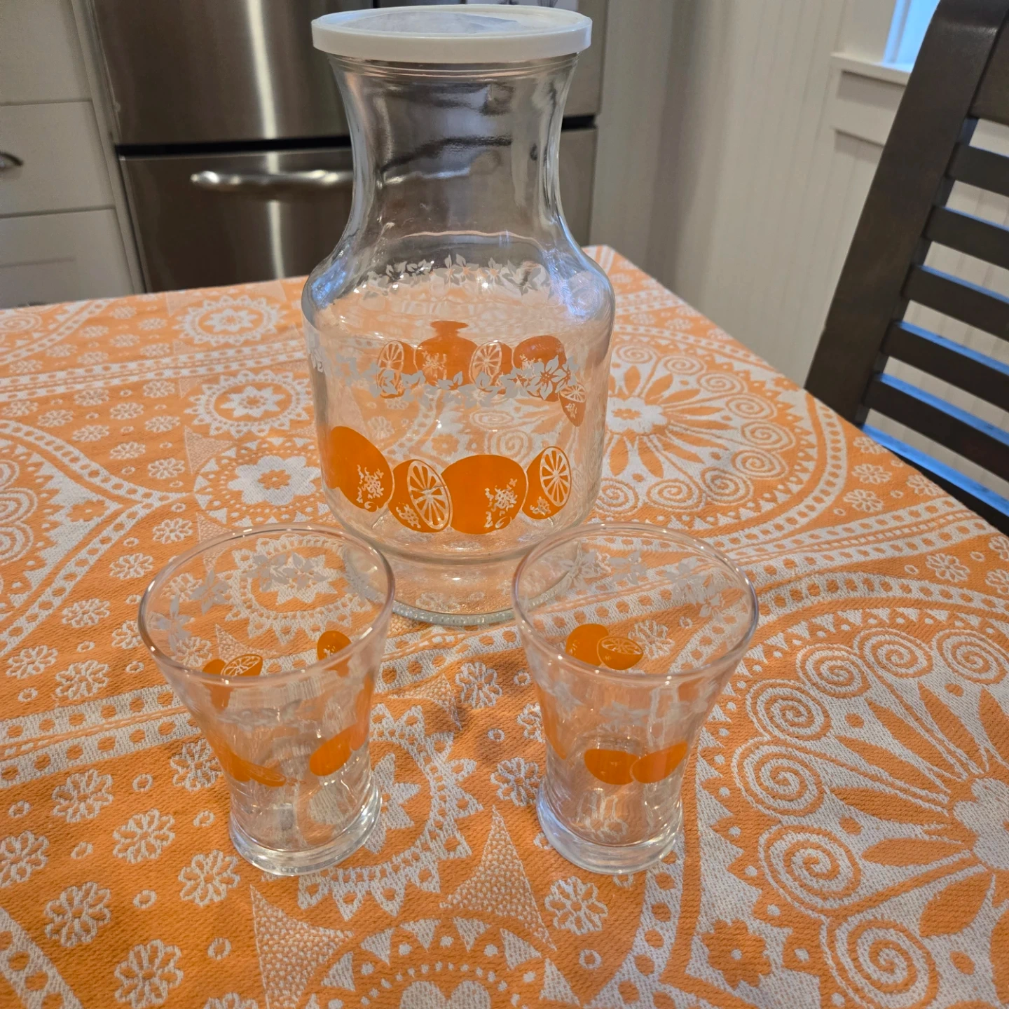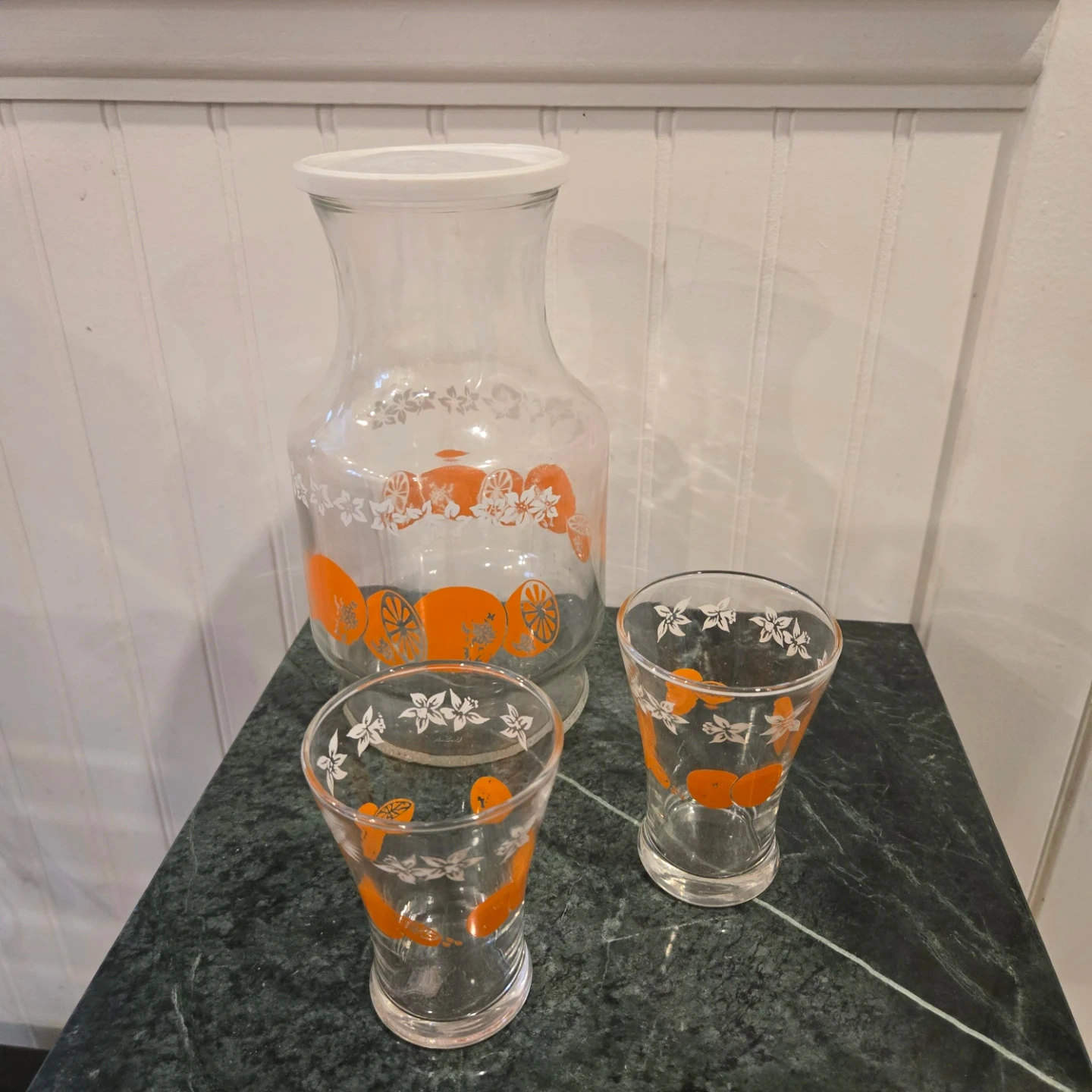 Here's a charming vintage pitcher and glasses set, perfect for adding a touch of retro flair to your kitchen or dining area! The set features a clear glass pitcher with a white lid and two matching glasses, all adorned with a delightful orange citrus design. It's in great condition and ready to brighten up your next gathering