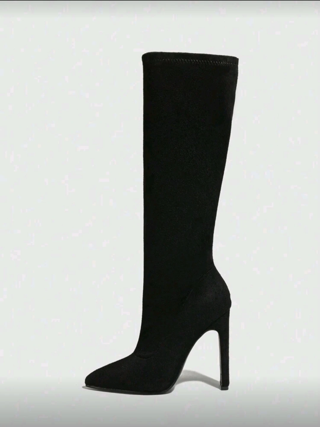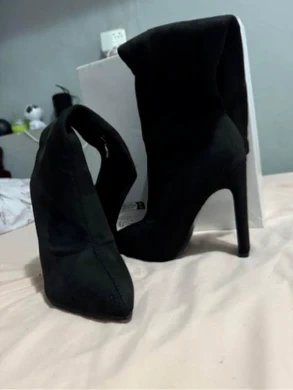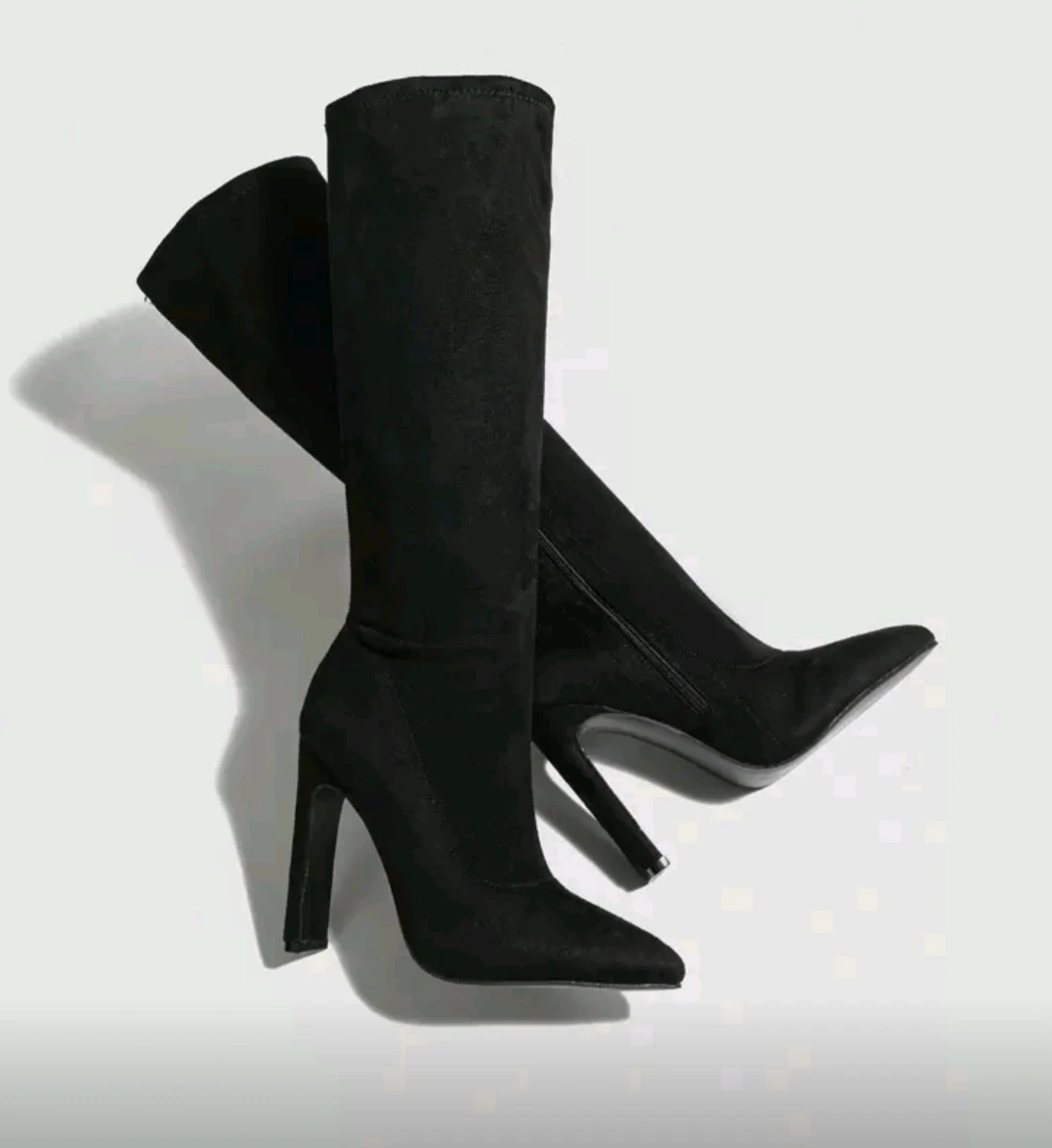 Selling a pair of stylish black knee-high stiletto boots! These boots are perfect for adding a touch of elegance to any outfit. They are in great condition and ready for a new home. Comes with the box