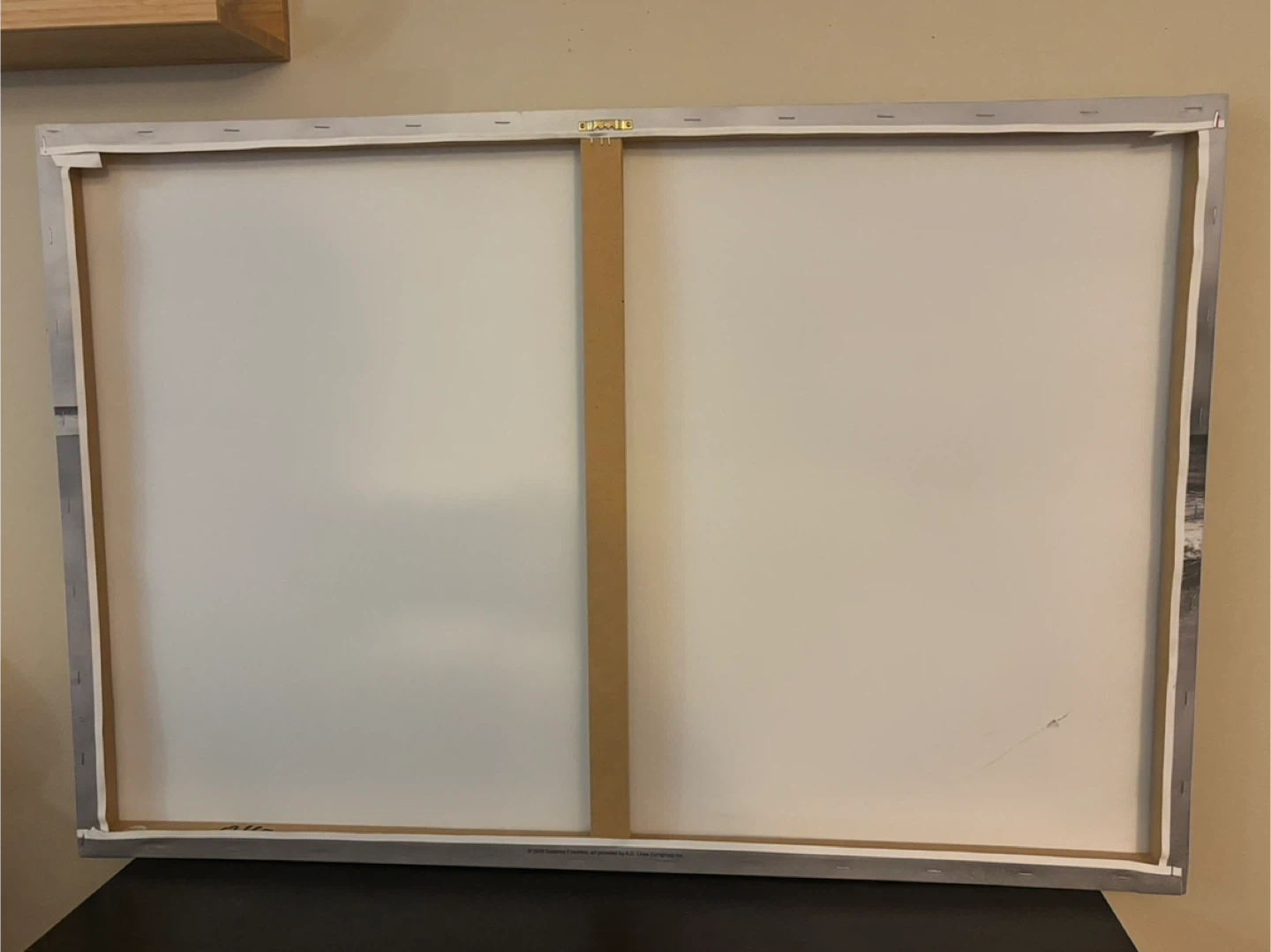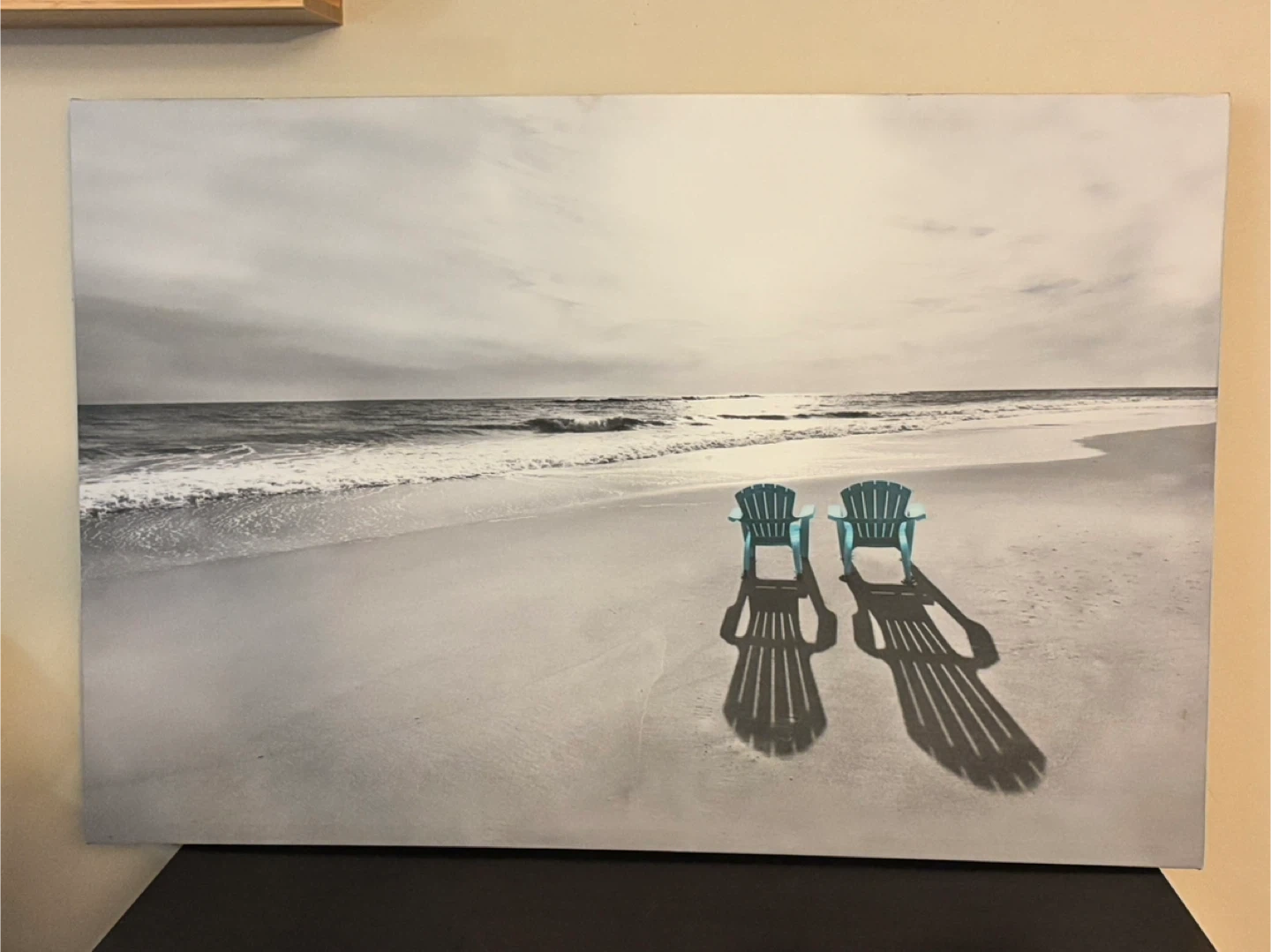 Canvas wall art featuring a serene beach scene with two chairs. It's in great condition and ready to brighten up any room in your home!