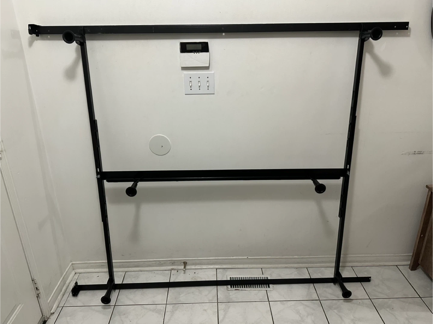 Selling a black metal bed frame. It's in great condition and is adjustable size. Was used to hold a king bed and box, can be used for queen bed too. It’s very sturdy!