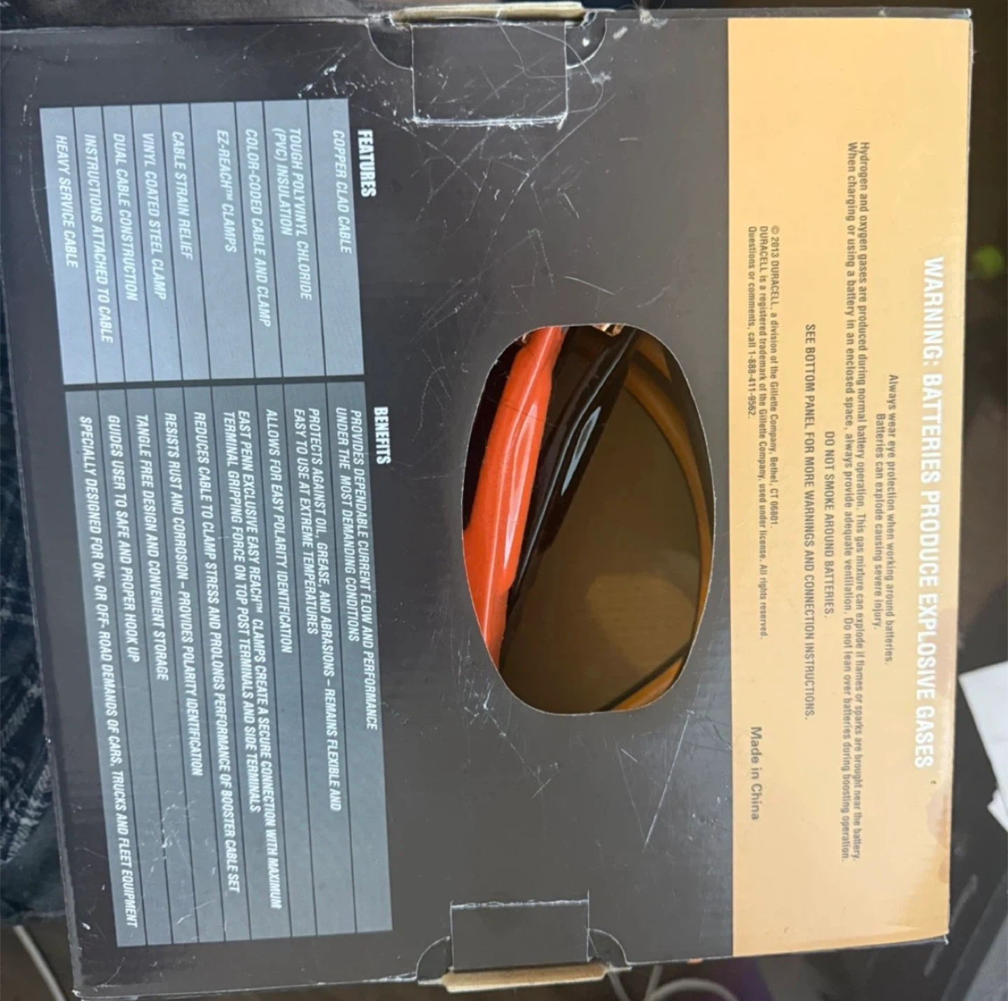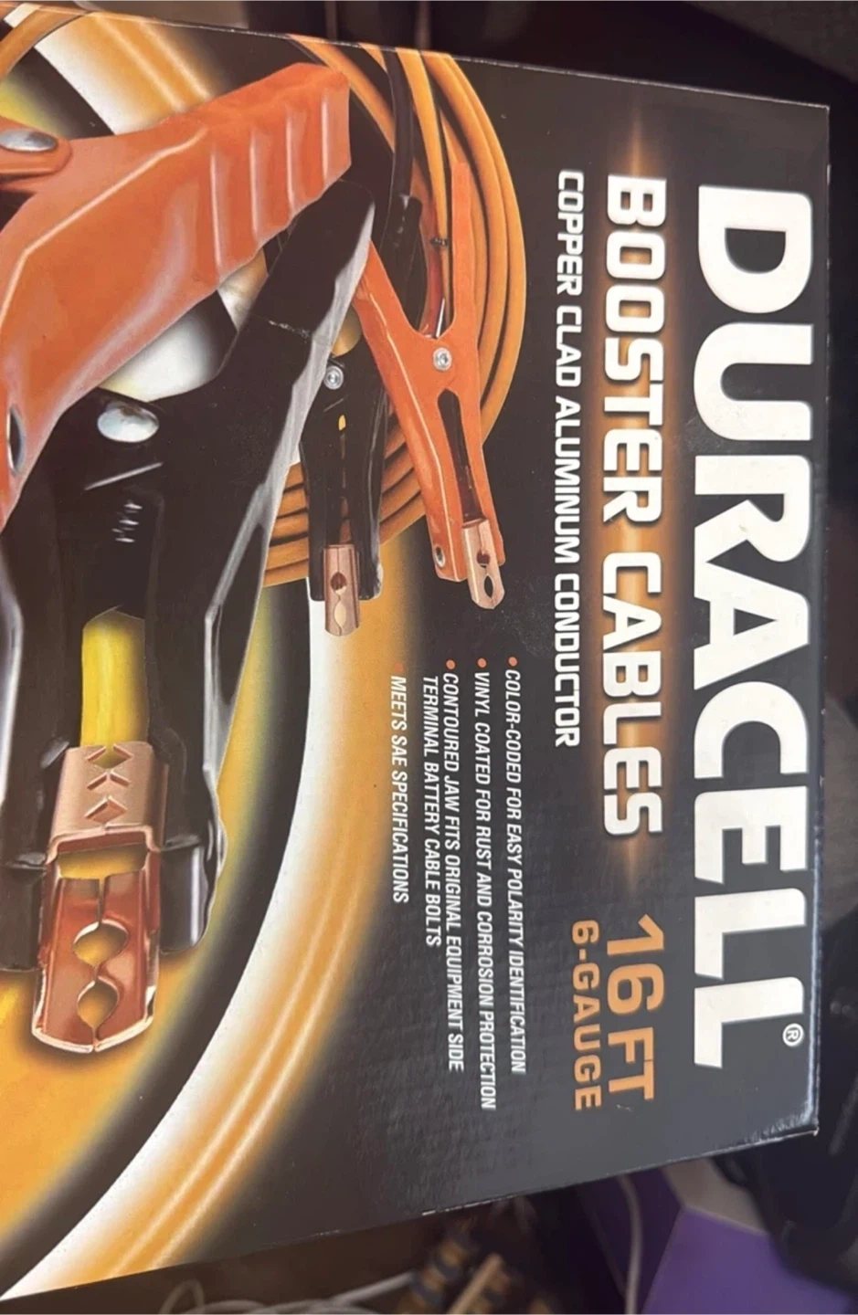 Selling a set of Duracell booster cables. These are 16 feet long and 6-gauge, perfect for heavy-duty service! The cables feature copper-clad aluminum conductors and are colour-coded for easy polarity identification. They're also vinyl-coated for rust and corrosion protection, ensuring they last a long time. Great for on-off road demands of cars, trucks, and fleet equipment