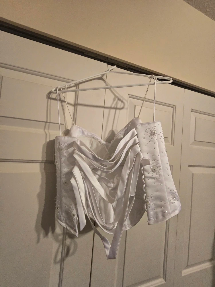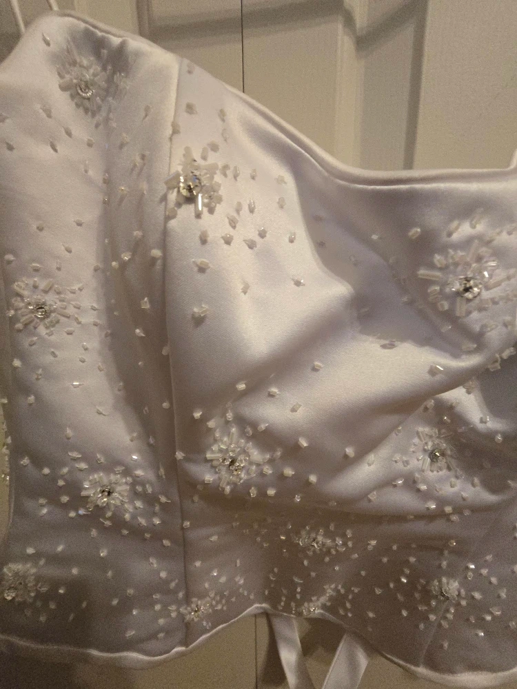 Selling a beautiful white wedding dress, size 8! It has a lovely design with beaded details. The style number is 7246. It's made of polyester and nylon.