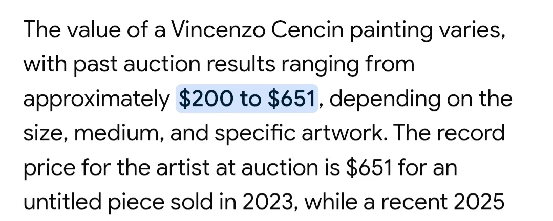 2 vintage italian paintings by Artist Vincenzo cencin. 30 inches long , 27 inches height, 2.5 inches thick frame. This is probably from the mid 1900s. Similar paintings but smaller size sold for $200-$300 each online. 2 for $250 great price. Cash. Pickup sheepshead bay brooklyn