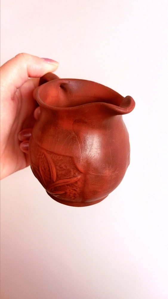 Here's a lovely brown clay pitcher, perfect for adding a rustic touch to your home. It has a unique design with a comfortable handle. It's in great condition and ready for a new home!