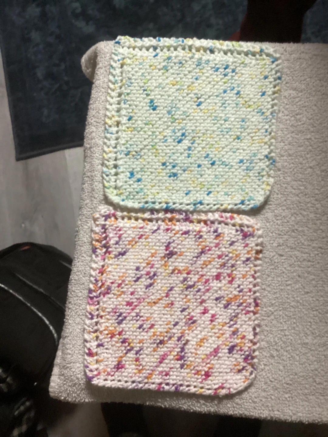 I have a set of two handmade knitted washcloths/hotpot coasters for sale. They are in good condition and ready to use! One is a mix of pink, orange, and purple, while the other is white with blue and yellow accents. Perfect for adding a touch of handmade charm to your bathroom,kitchen, living room