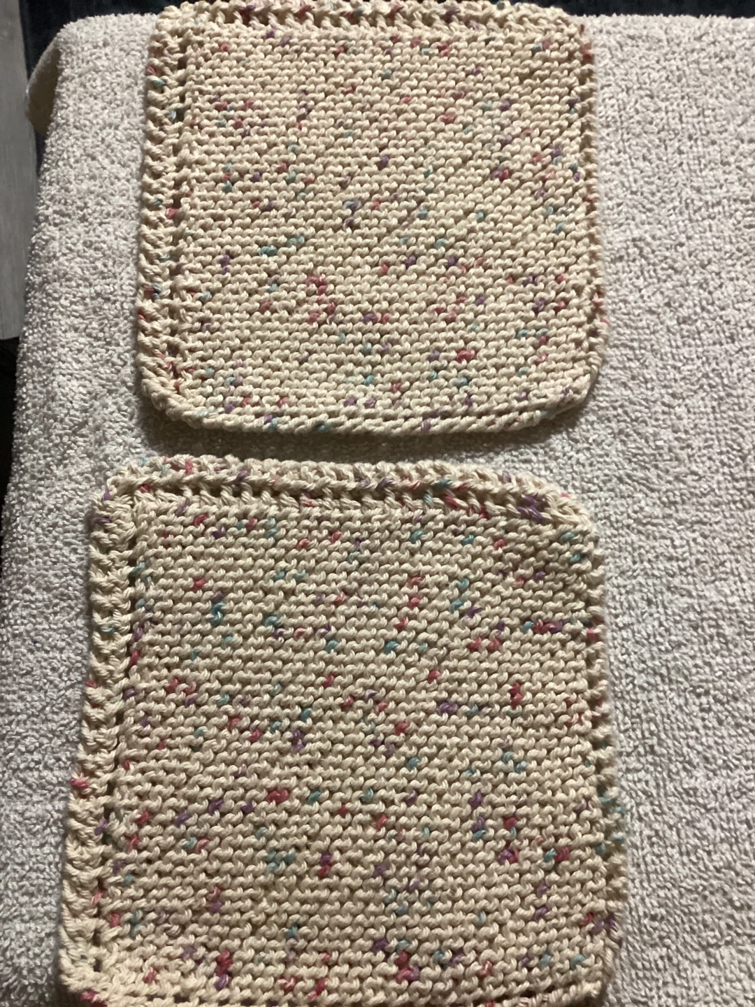 Selling a set of two handmade knitted dishcloths/hotpot coasters . They are made of cotton and have a nice textured feel. Perfect for cleaning up around the kitchen or for putting your hot plates on!