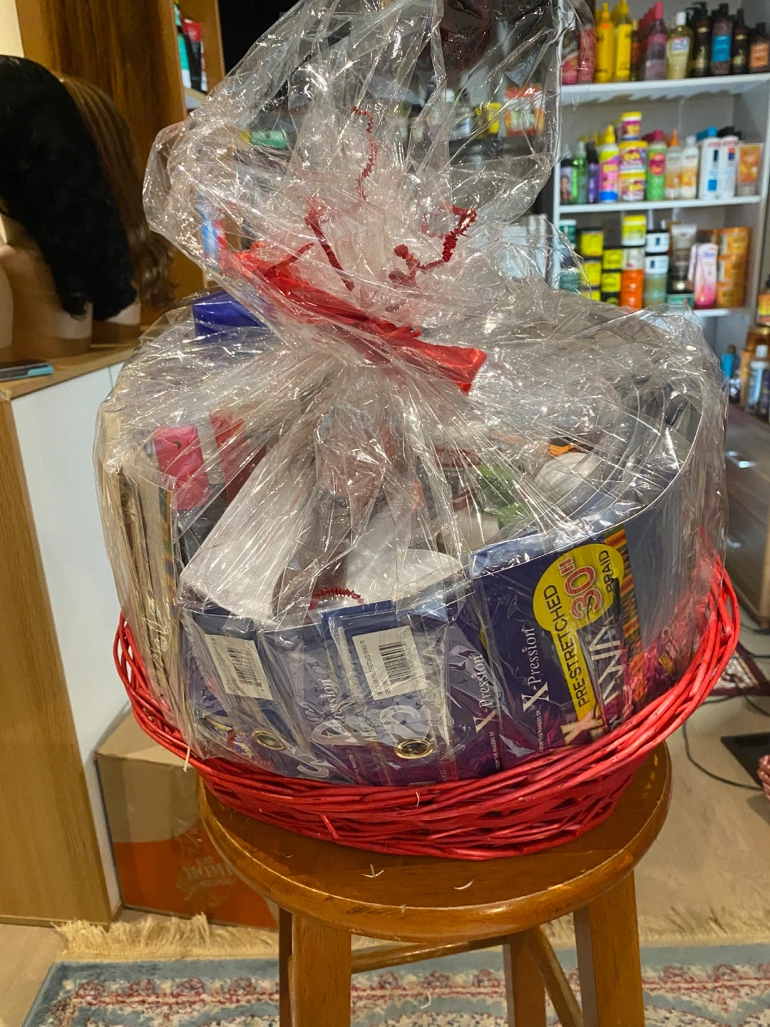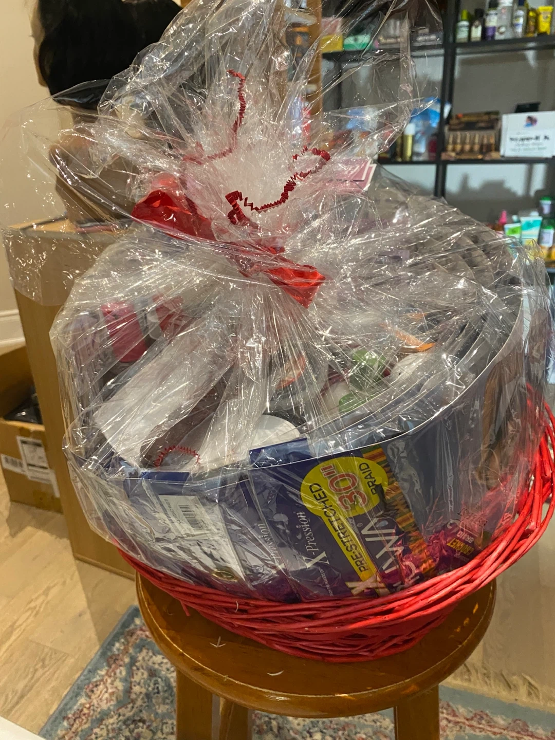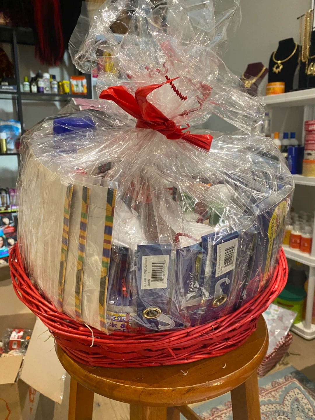 Selling a gift basket filled with assorted items! It's all wrapped up and ready to go. Perfect for a special occasion or just to treat yourself