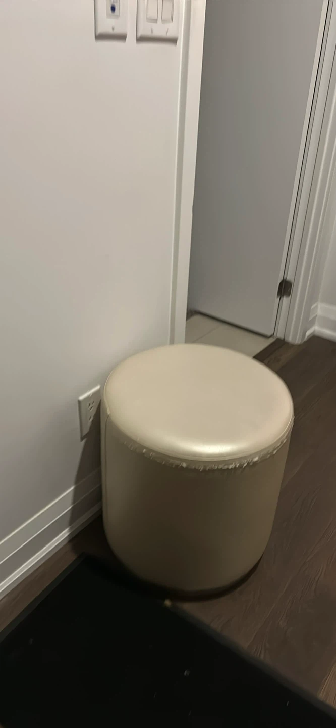 Selling a beige round ottoman. It's showing some signs of wear and tear, as you can see in the photos. It could be a great addition to your living room or bedroom!
