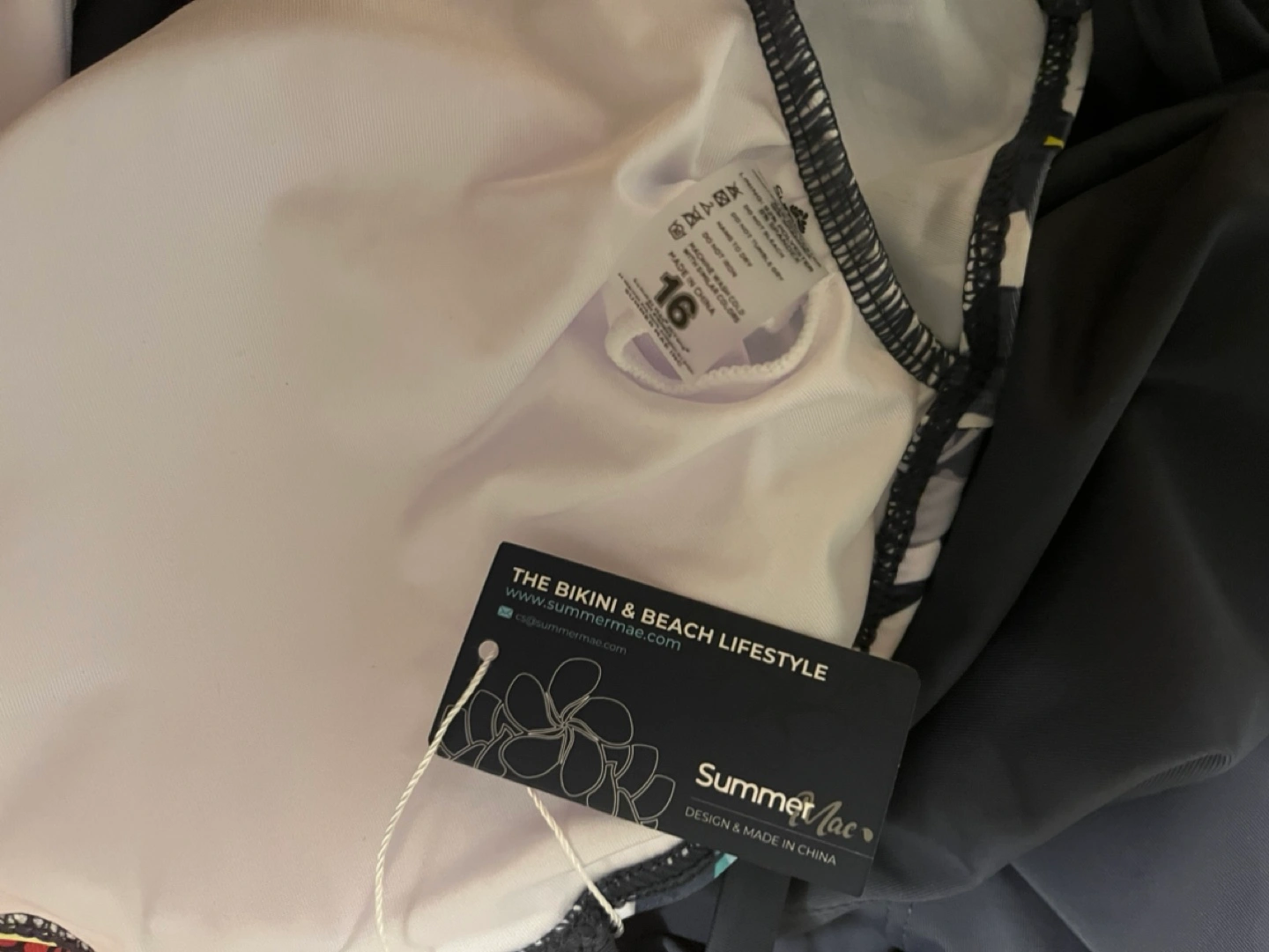 Summer Mae swimdress in size 16! It's a stylish two-pieces with a floral top ,a solid skirt, and shorts perfect for the beach or pool. The material is comfortable and provides good coverage!