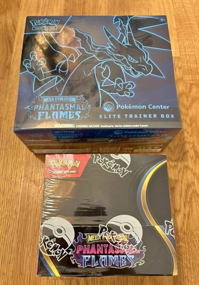 Pokemon TCG Mega Evolutions Phantasmal Flames Sealed Pokemon Center Elite Trainer Box 320 each Booster Box 380 Last available One set (includes two pc etbs and one booster box) $850 Cash or emt only Pick up to be scheduled.