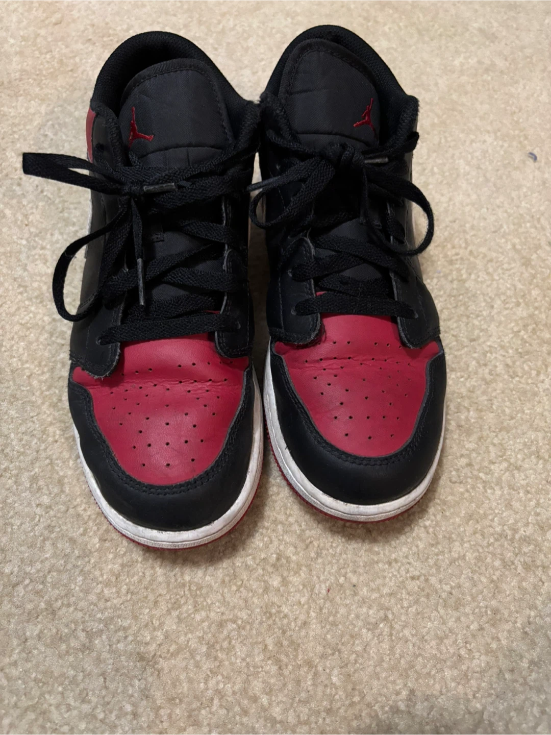 Selling a pair of Nike Air Jordan 1 Mid sneakers in size 7Y. They feature a classic black and red colourway with the iconic Jordan logo. Great for everyday wear!
