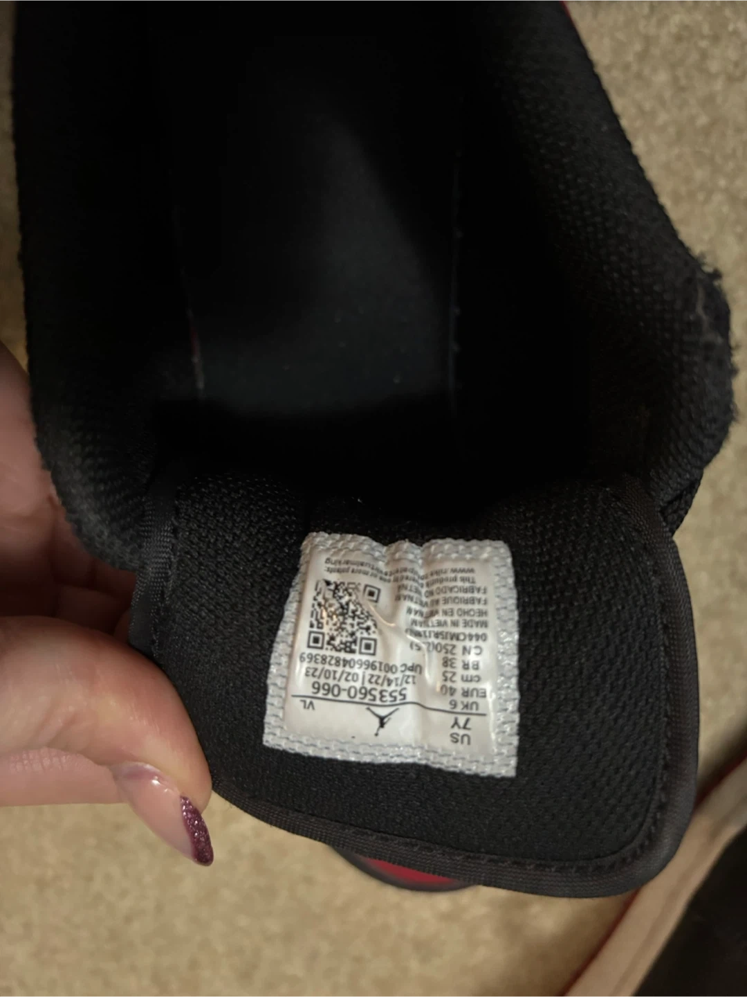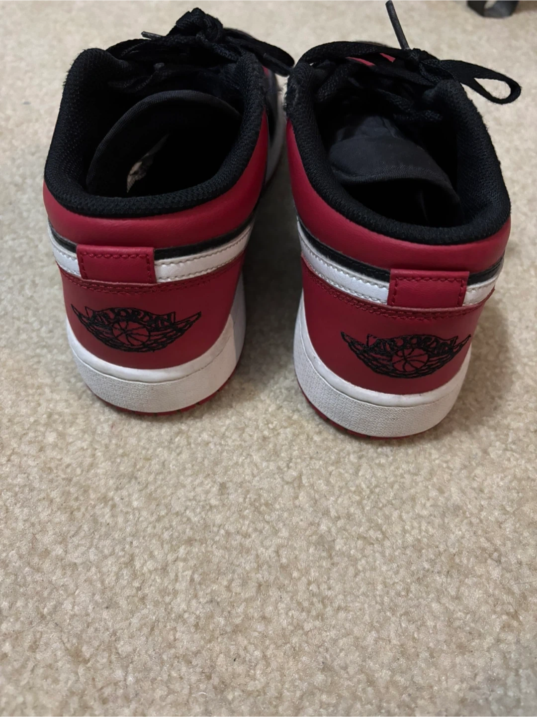 Selling a pair of Nike Air Jordan 1 Mid sneakers in size 7Y. They feature a classic black and red colourway with the iconic Jordan logo. Great for everyday wear!
