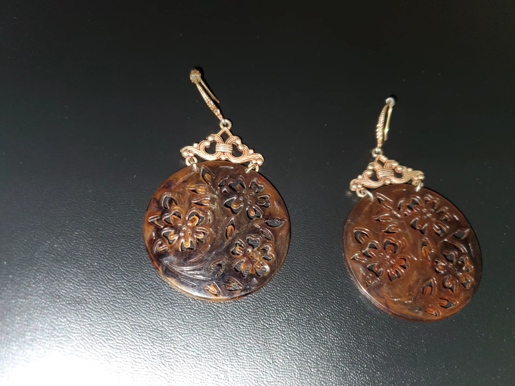 Selling a pair of vintage earrings with a unique floral carved design! They have a warm, brown tone and intricate details. The earrings have a hook closure and are in great condition, ready to add a touch of vintage charm to your style
