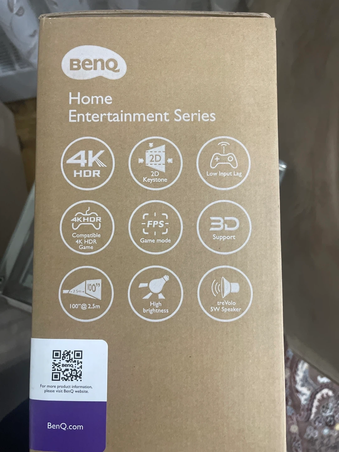 Selling a BenQ projector from the Home Entertainment Series. It comes with the original box. It's designed to brighten up your entertainment with vivid visuals. Enjoy features like 4K HDR, 2D Keystone, and low input lag. It also has a game mode, 3D support, and a treVolo 5W speaker. I can make a delivery for extra charges .