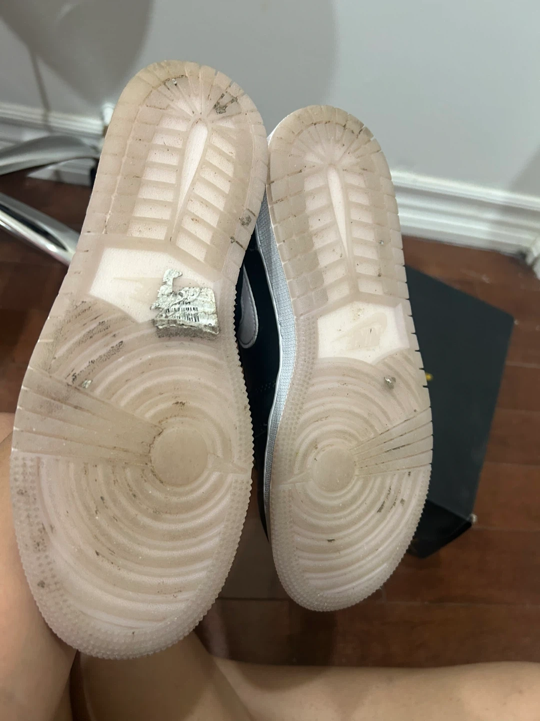 Selling a pair of Air Jordan 1 Low SE (GS) sneakers in black, white, and lilac. They are a size 6.5 US and come with the original box. There are some signs of wear on the soles and toe box, but they're still in good condition!