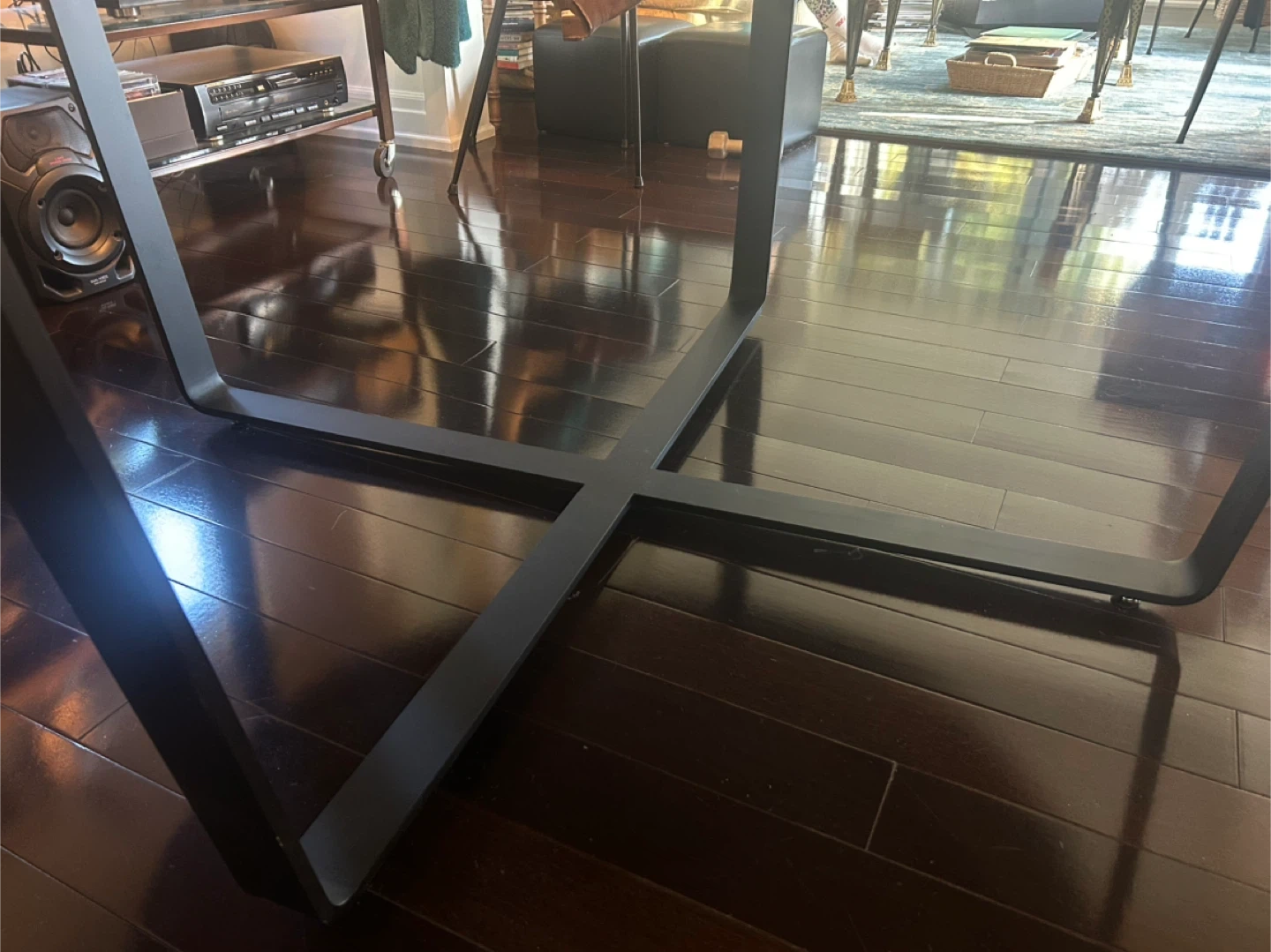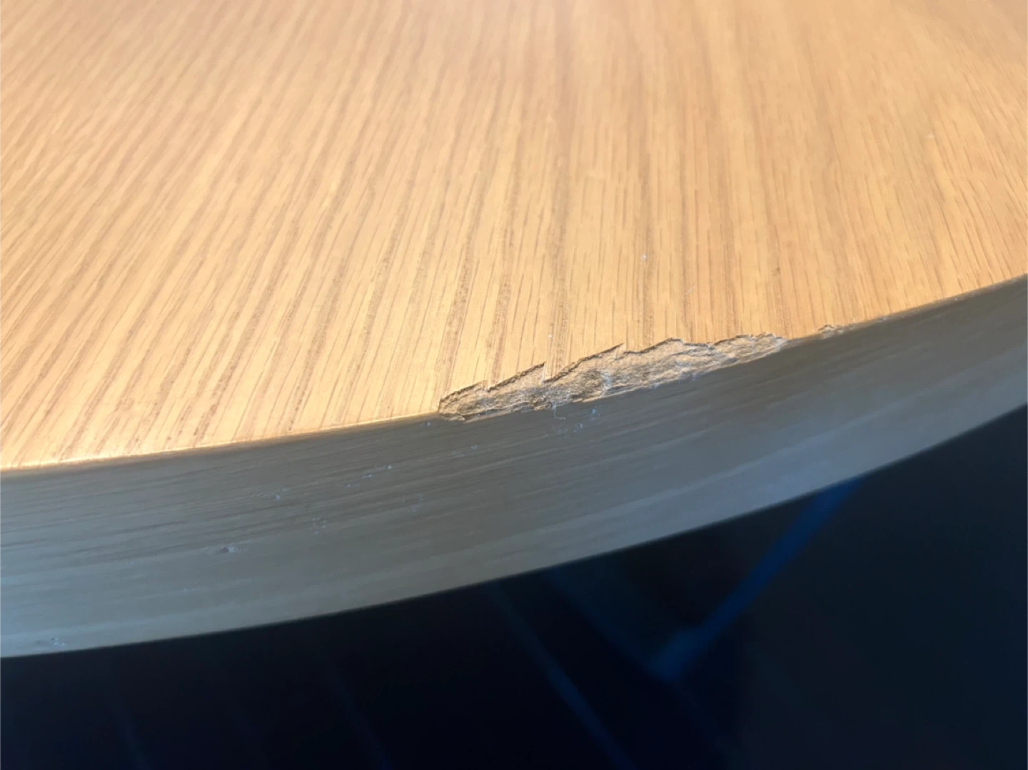 Selling a round wooden dining table. There is some damage to the edge of the table as shown in the photos. The base is black metal. 5ft in diameter.
