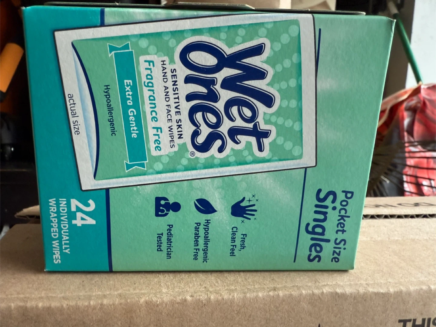 Selling a box of Wet Ones Pocket Size Singles. These are great for sensitive skin, fragrance free. Each box contains 24 individually wrapped wipes, perfect for on-the-go use! They're hypoallergenic and provide a fresh, clean feel anytime, anywhere