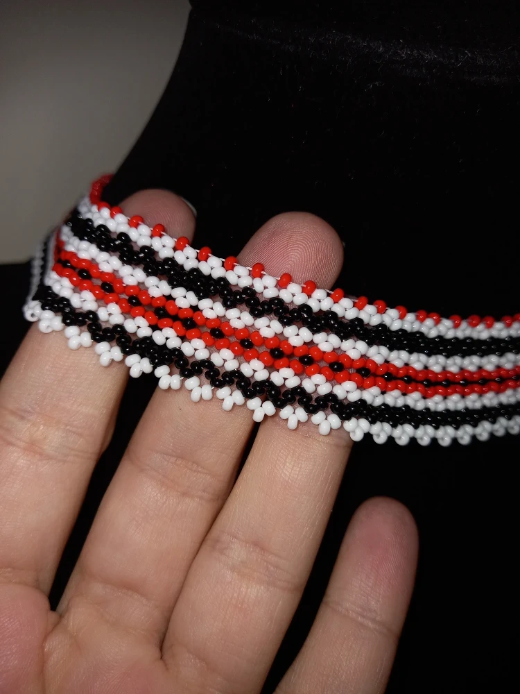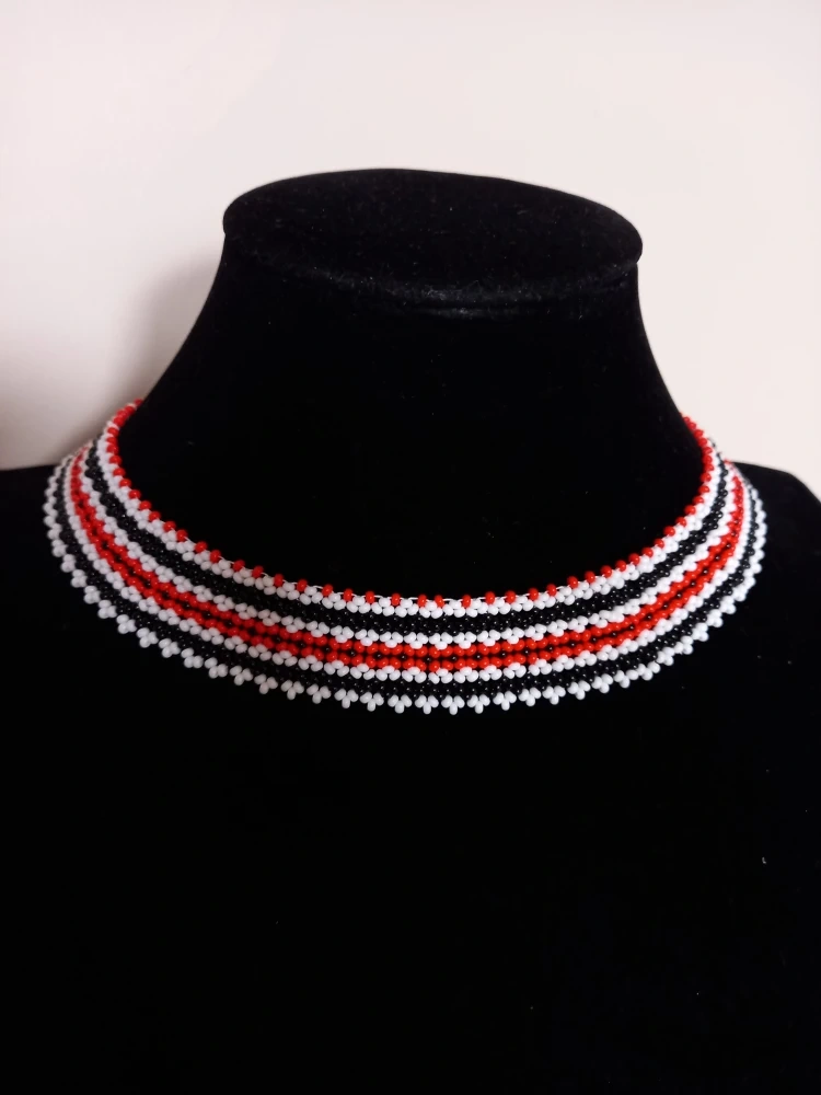 It features a striking design with red, white, and black beads. It's perfect for adding a pop of colour and texture to any outfit.