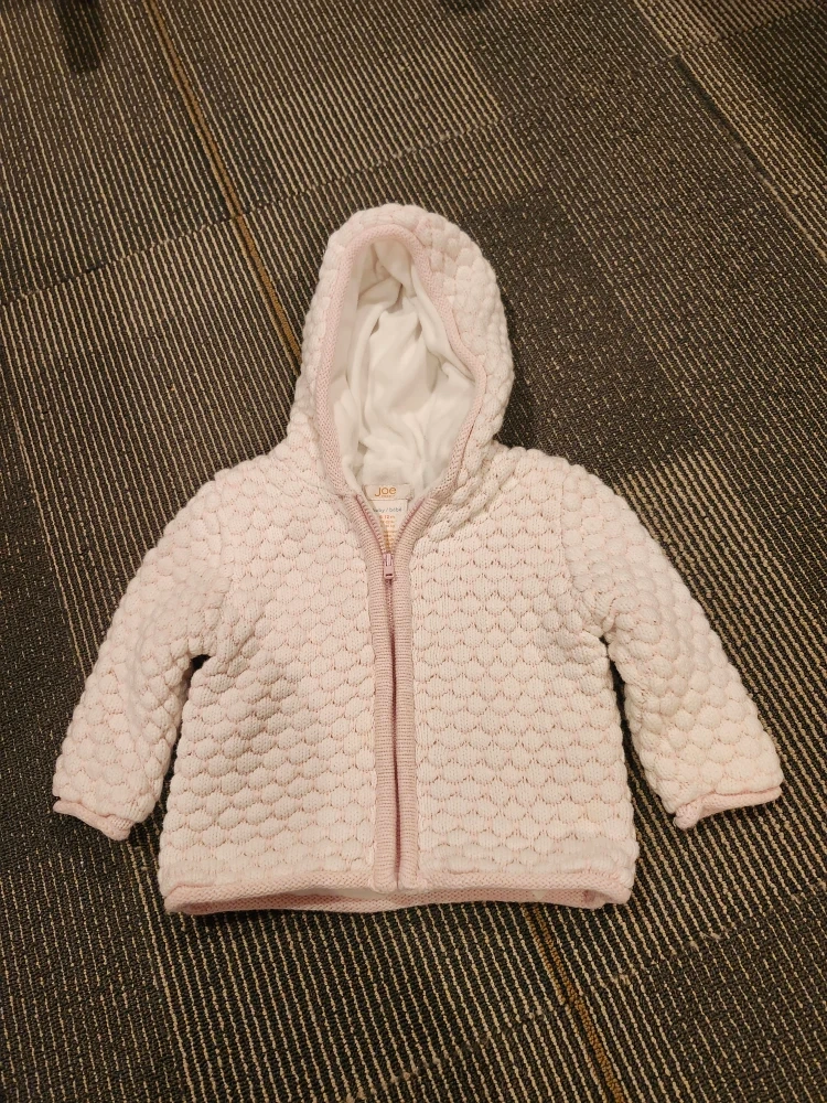 Pink sweater wore a few times from Jack and Jill size 6-12 months red puff jacket from baby Zara size 9-12 months and white and pink sweater from Joe fresh size 6-12 months.All in good condition