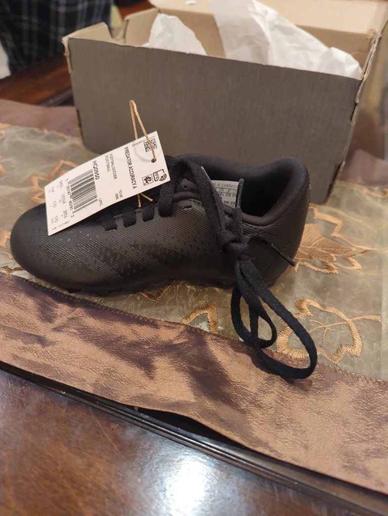 Selling a pair of brand new Adidas Predator Accuracy.4 kids' football shoes in black! They come with the original box. My kid never used it as we got the wrong size it is very new and we got it 3 days ago