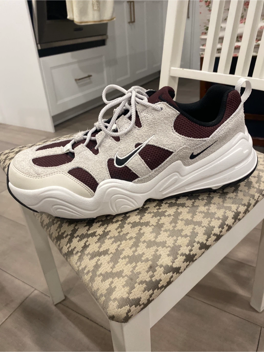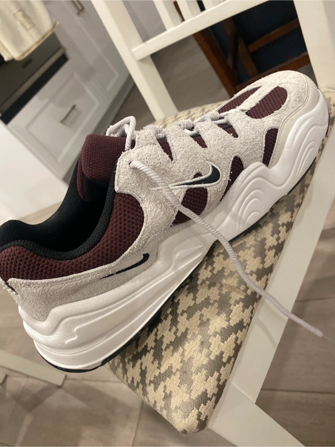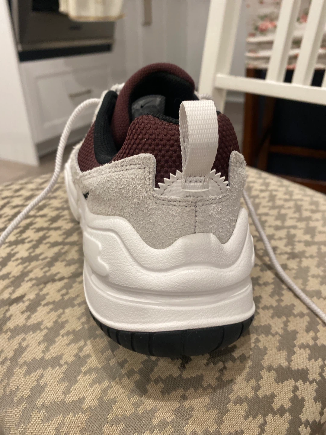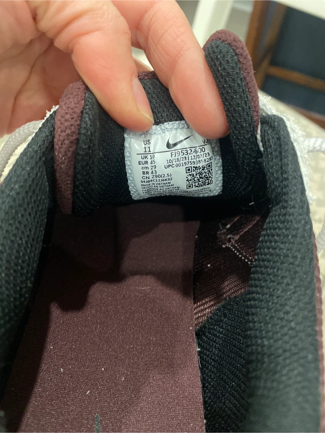 Selling a pair of Nike sneakers, model number F19532-600, in US size 11. They have a unique design with white and burgundy accents. The manufacturing date is 2023 October 18.