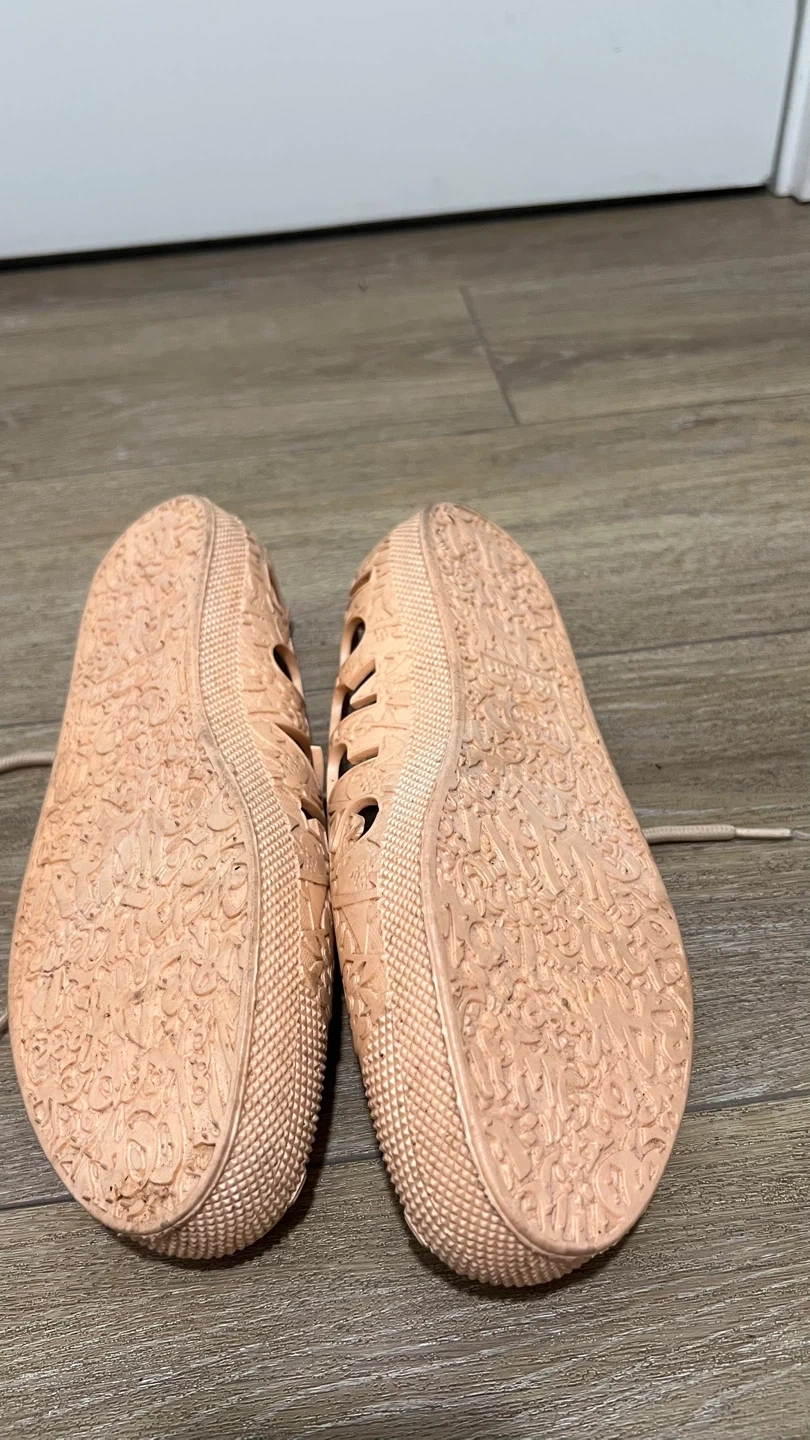 Selling a pair of Melissa 'Love System' shoes in a lovely peach colour! They're a women's size 7. These shoes have a unique design with cutouts and the word 'LOVE' along the sides.