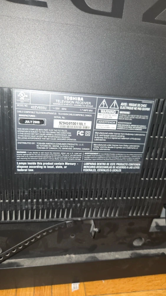Selling a Toshiba Regza television. The model number is 42ZV655U. Manufactured in July 2009. It has HDMI and other ports in the back.