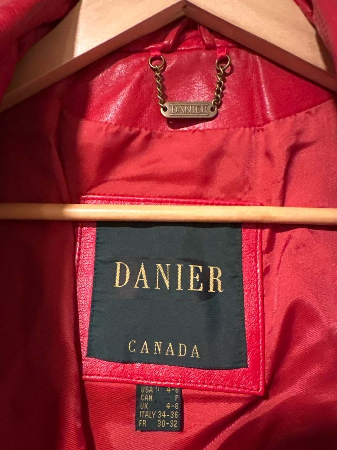 Selling a vibrant red leather jacket from Danier Canada. The size is listed as 4-6. It's in great shape, no sign of wear, like new.