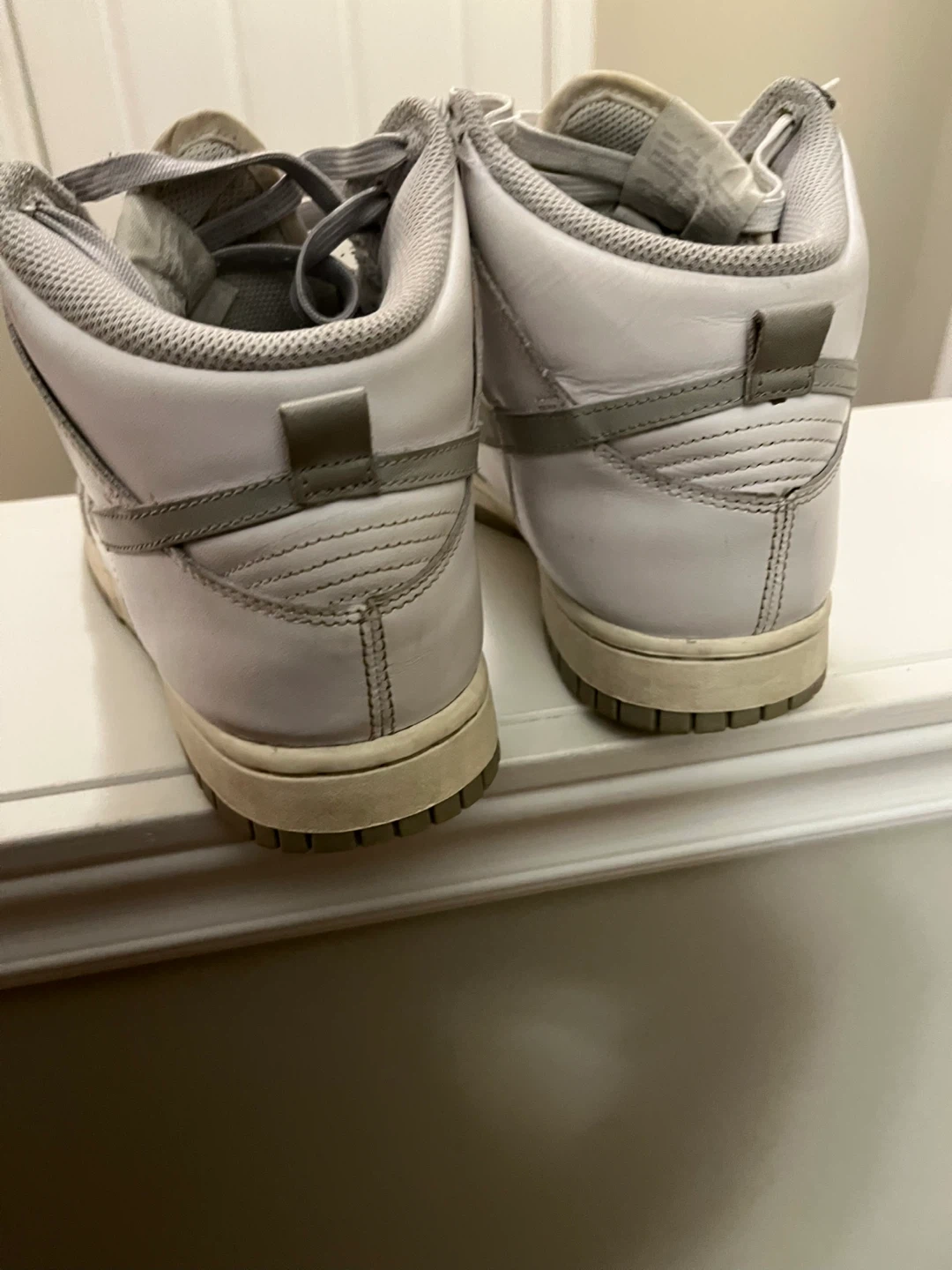 Selling a pair of Nike Dunk Highs in white and grey. They are in used condition, as shown in the photos. The size is a US 8.5. These were bought in France