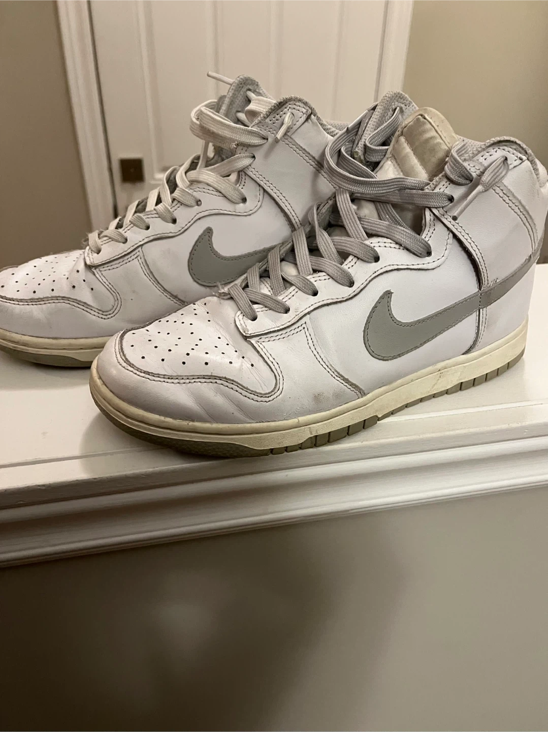 Selling a pair of Nike Dunk Highs in white and grey. They are in used condition, as shown in the photos. The size is a US 8.5.