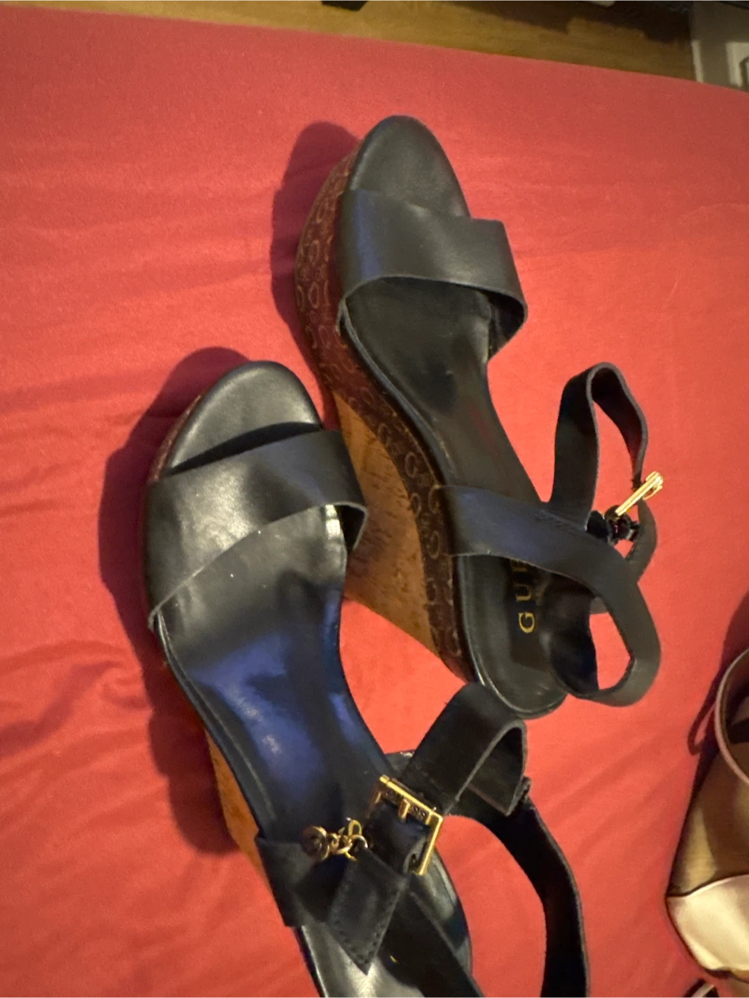 Selling a pair of Guess black wedge sandals. They feature a stylish wedge heel with the Guess logo design and an ankle strap with buckle closure. Perfect for adding a bit of height and style to your outfit!